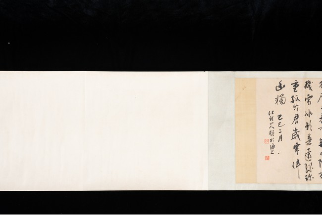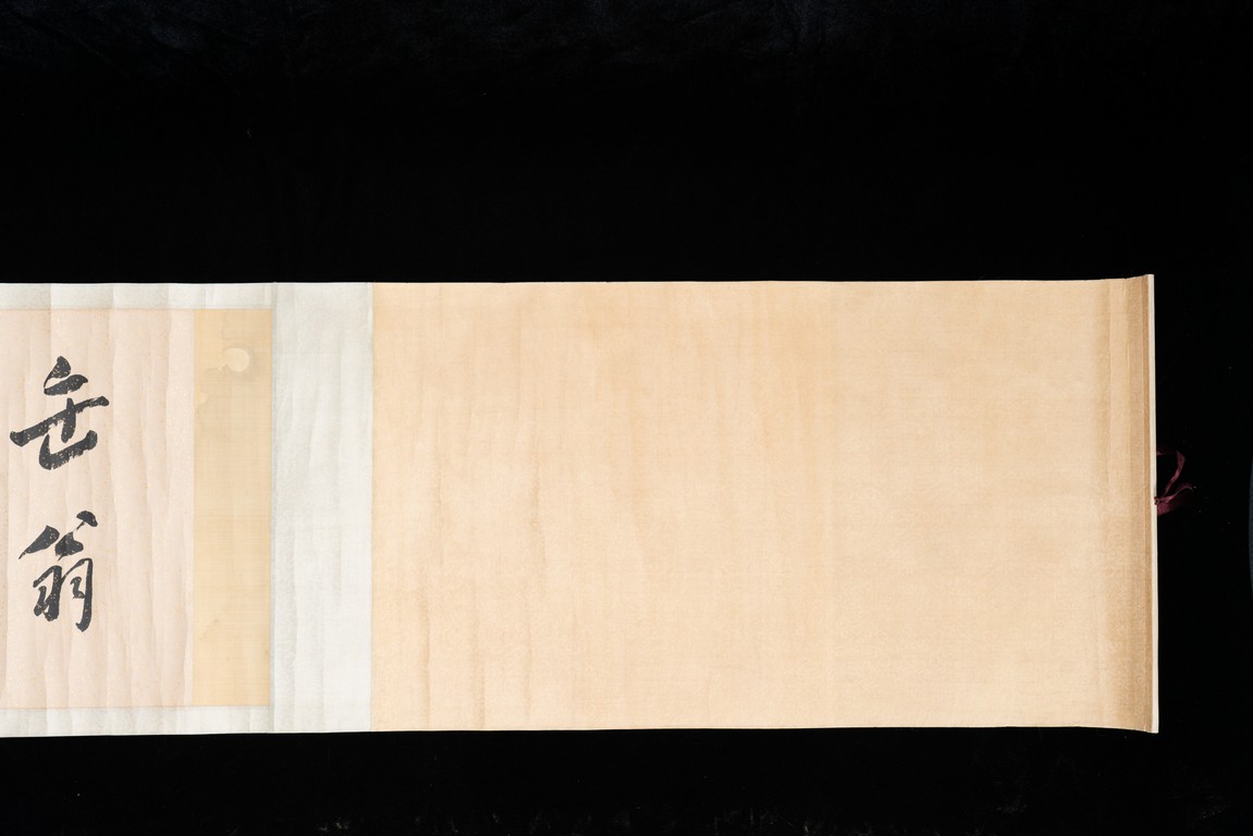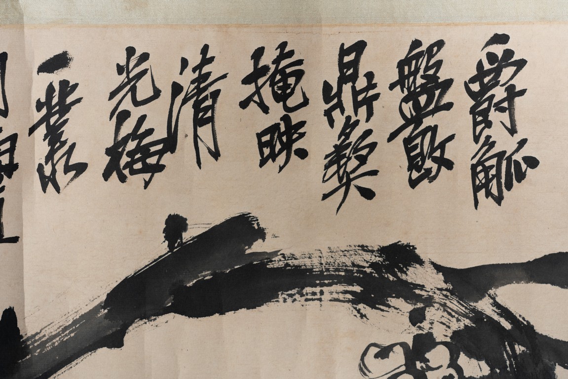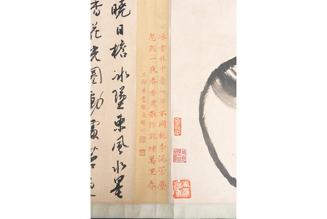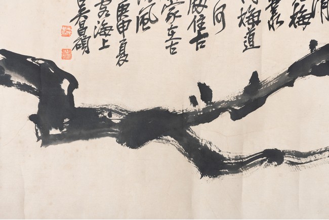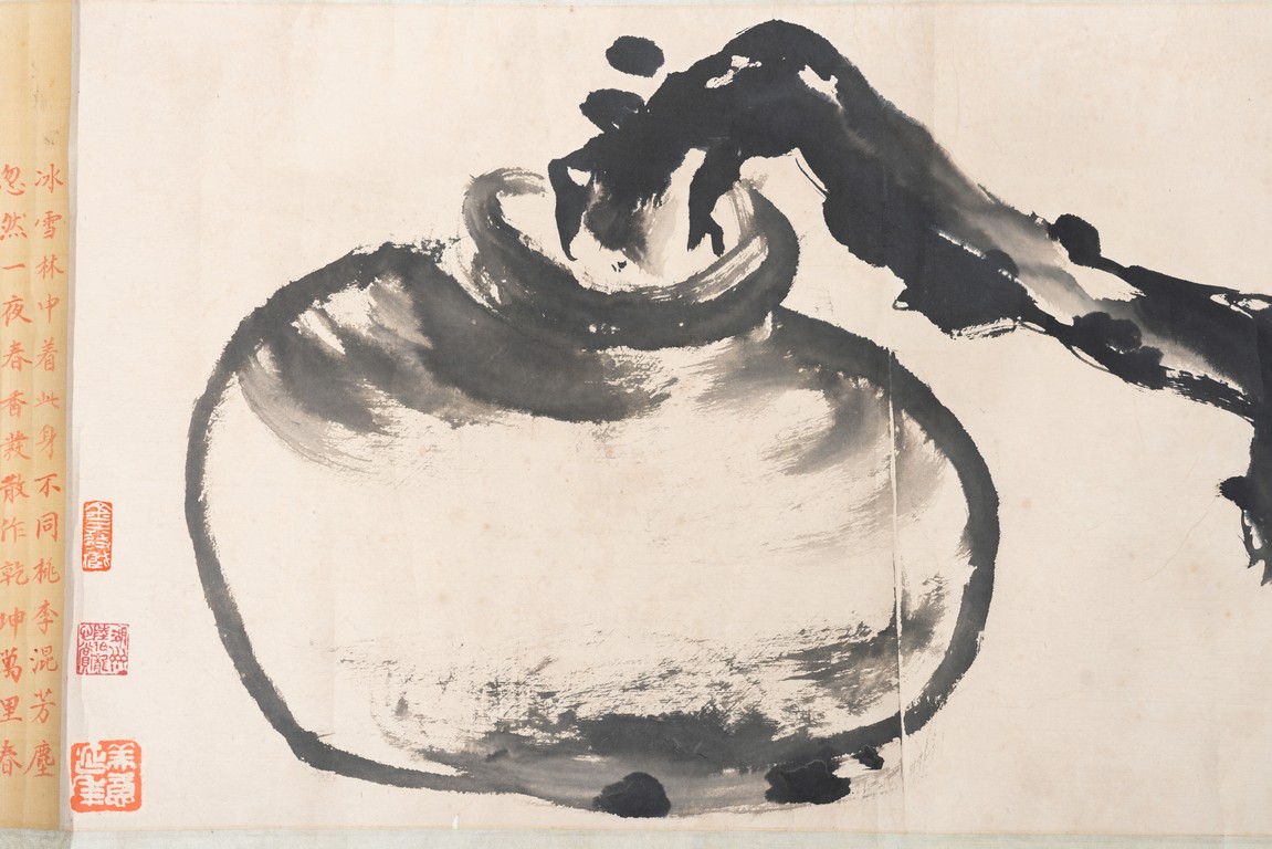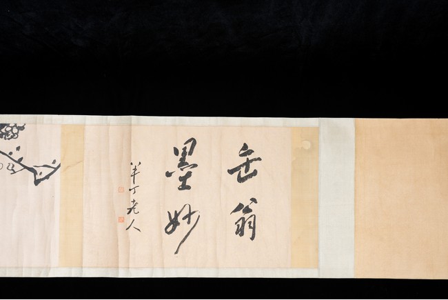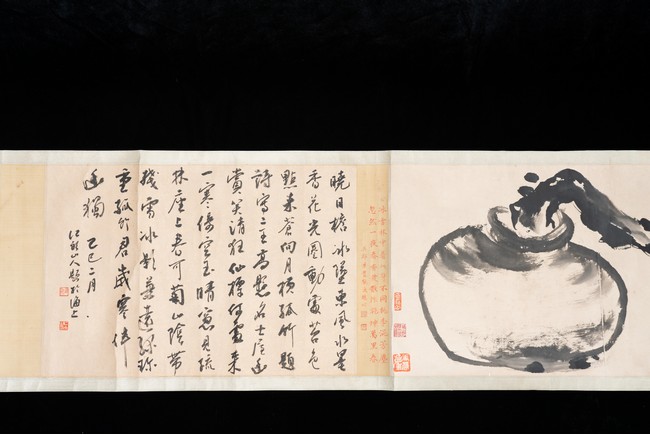 Chinese. Ink on paper. Plum blossoms. Handscroll. Inscribed and signed Wu Changshuo with five seal marks. With frontispiece signed Ban Ding Lao Ren with two seal marks, and two colophons with four seal marks in total.