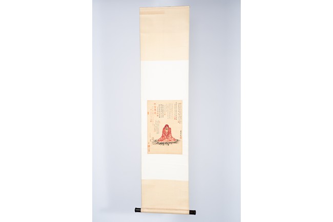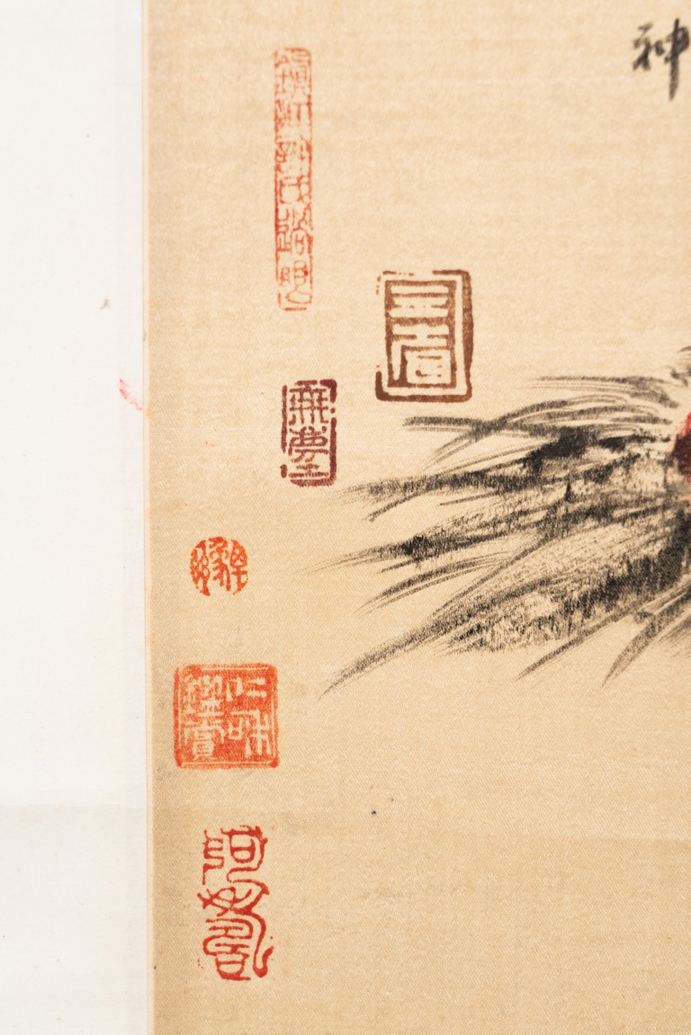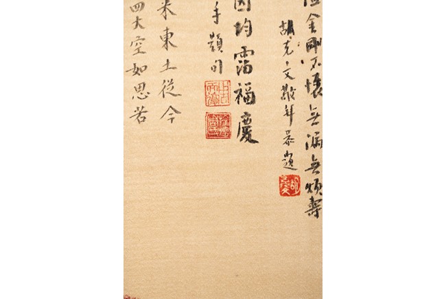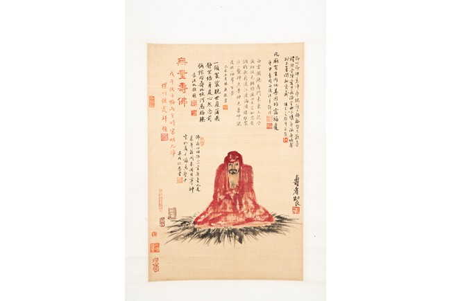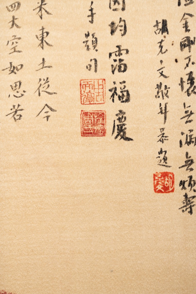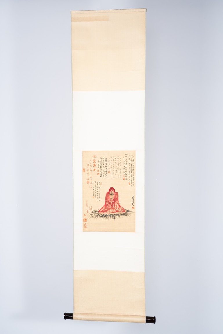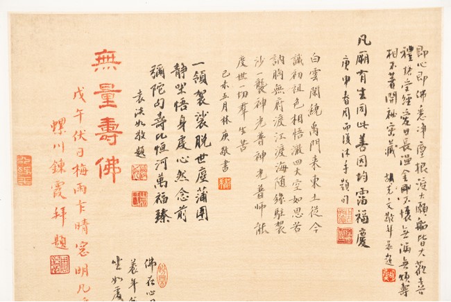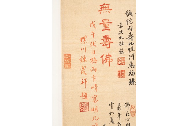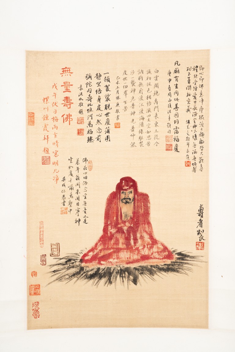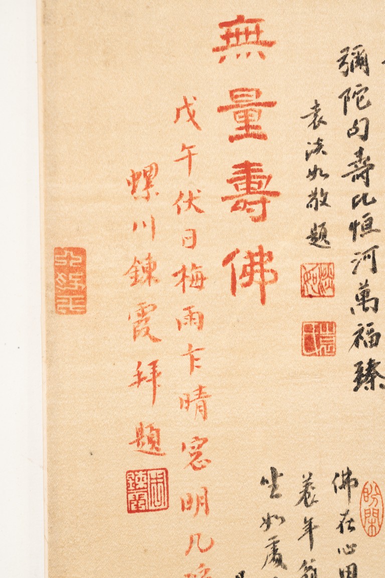 Chinese. Color and ink on Satin. Amitabha. Hanging scroll. Signed Shou Zhezhi, with one seal mark. Further inscribed with annotations and comments by various collectors and stamped with their seal marks.