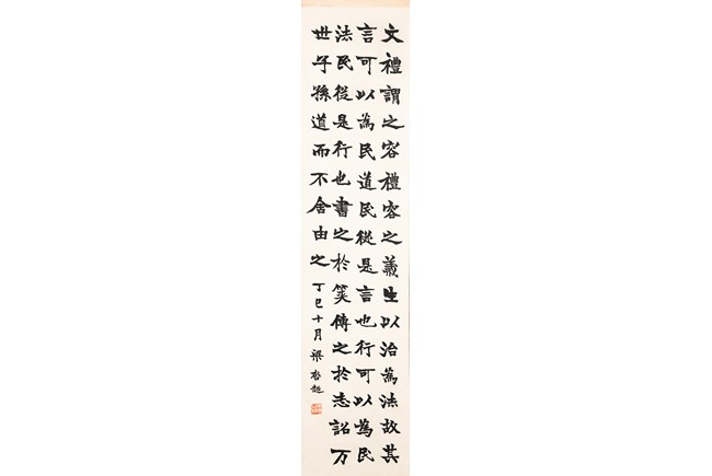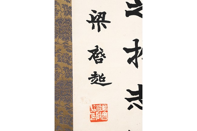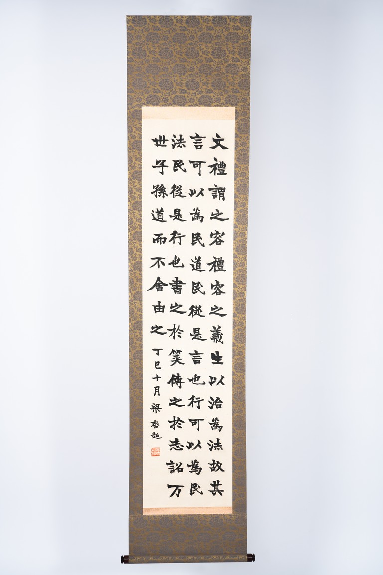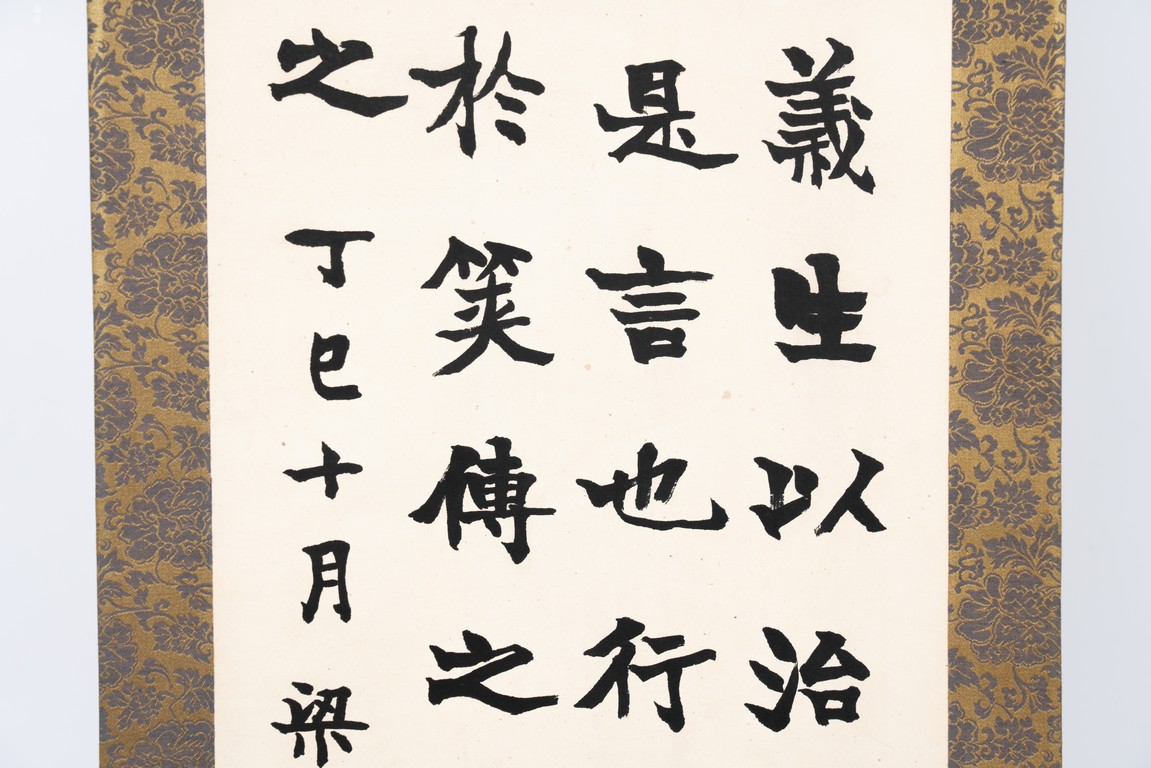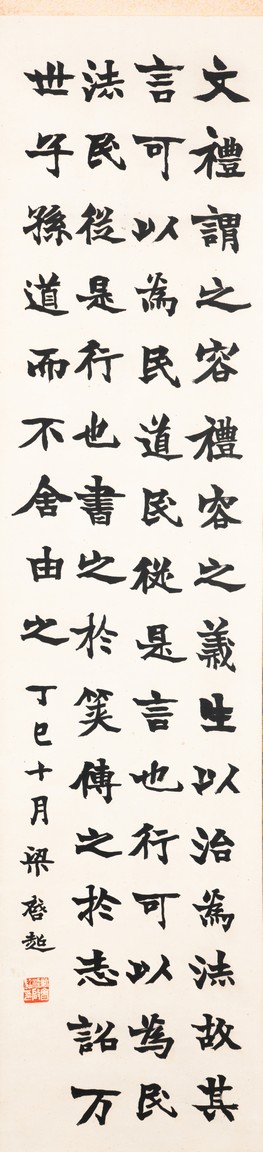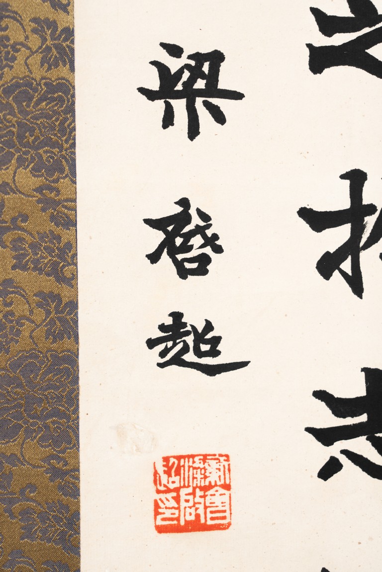 Chinese. Ink on paper. Regular script calligraphy, excerpt from Han shi waizhuan. Hanging scroll. Signed Liang Qichao and dated to the October 1917, one seal mark of the artist.