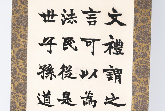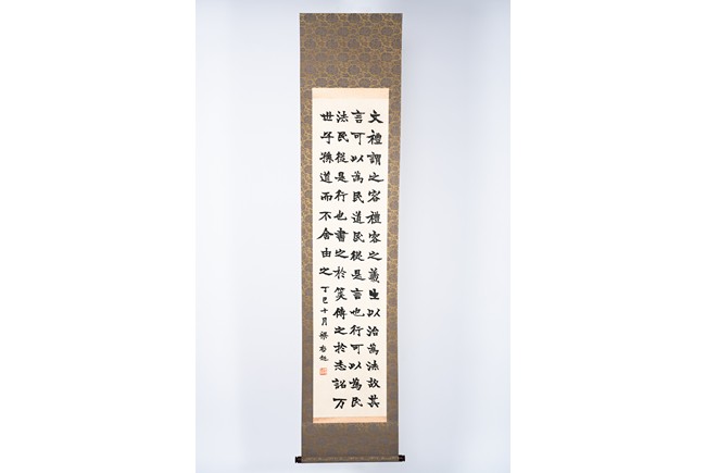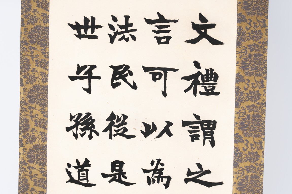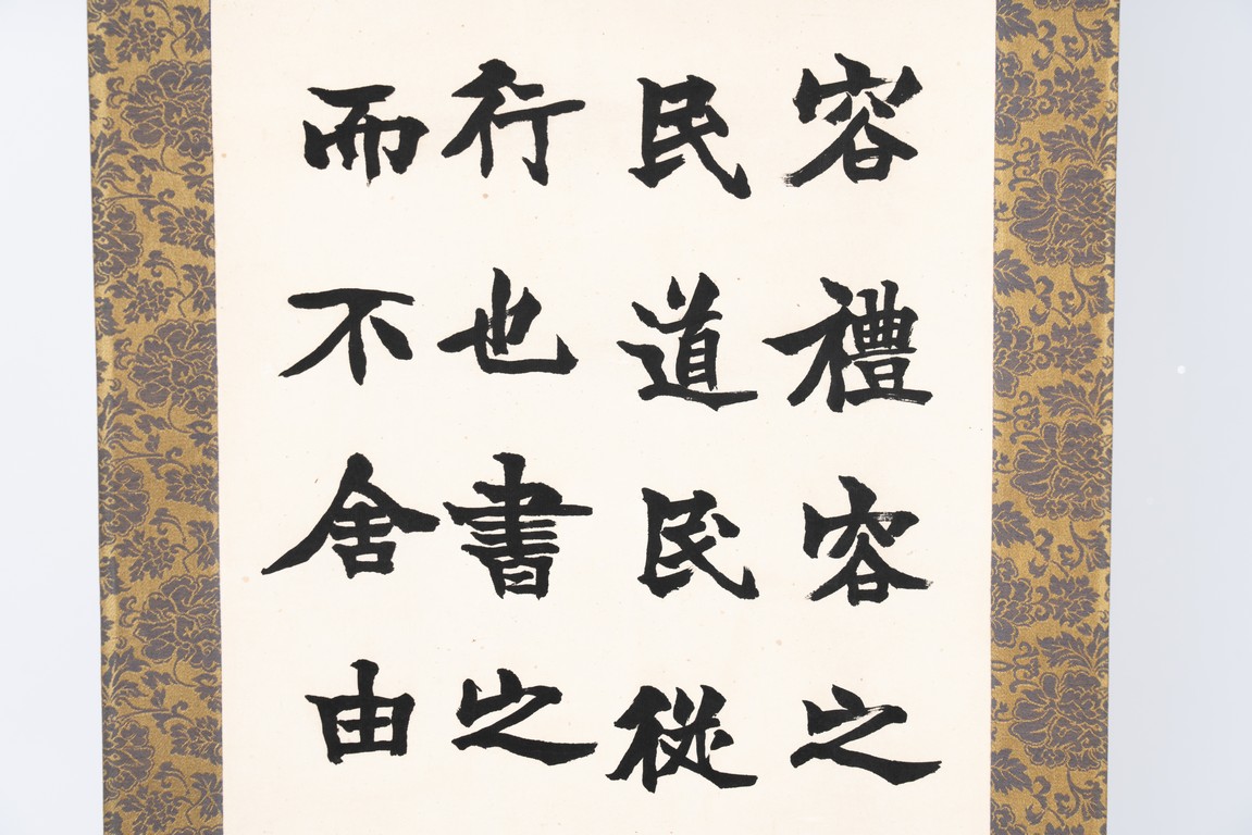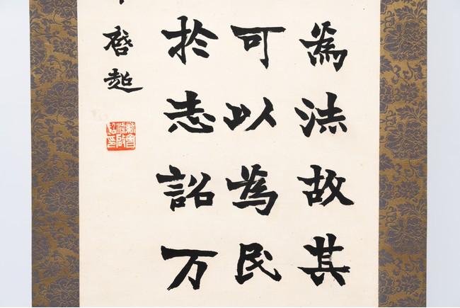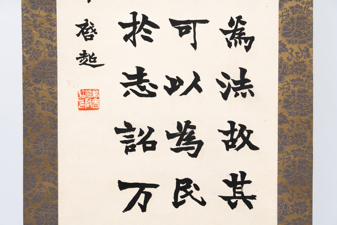 Chinese. Ink on paper. Regular script calligraphy, excerpt from Han shi waizhuan. Hanging scroll. Signed Liang Qichao and dated to the October 1917, one seal mark of the artist.
