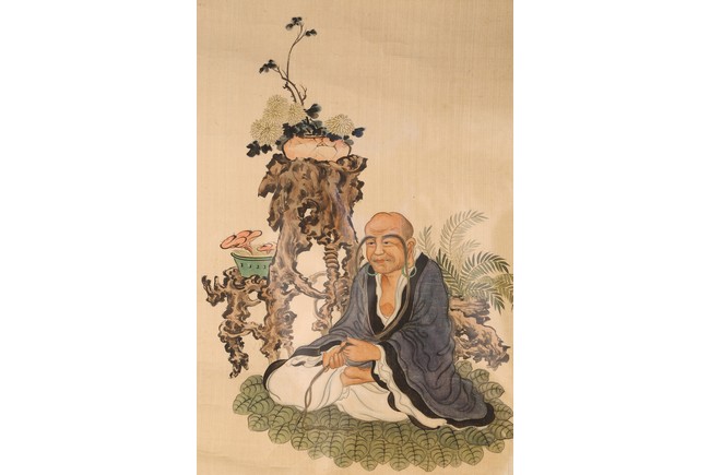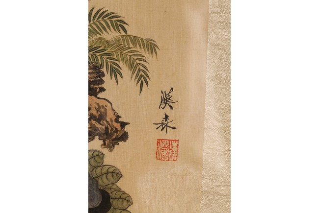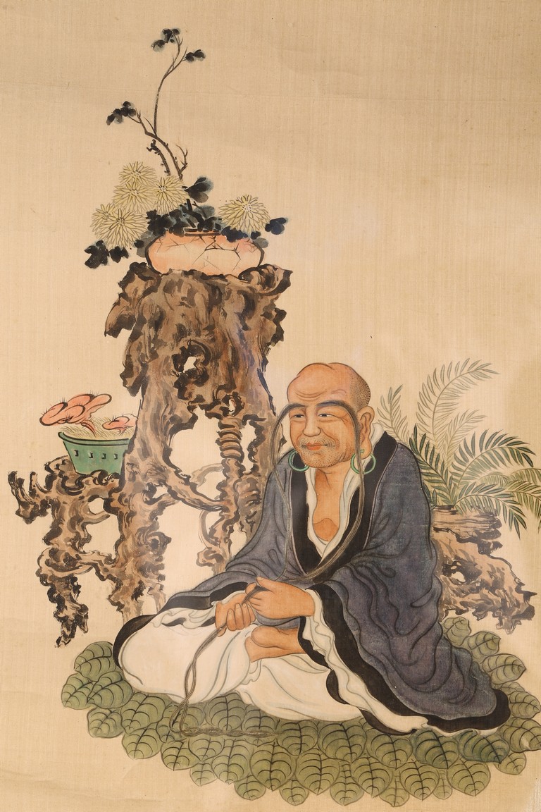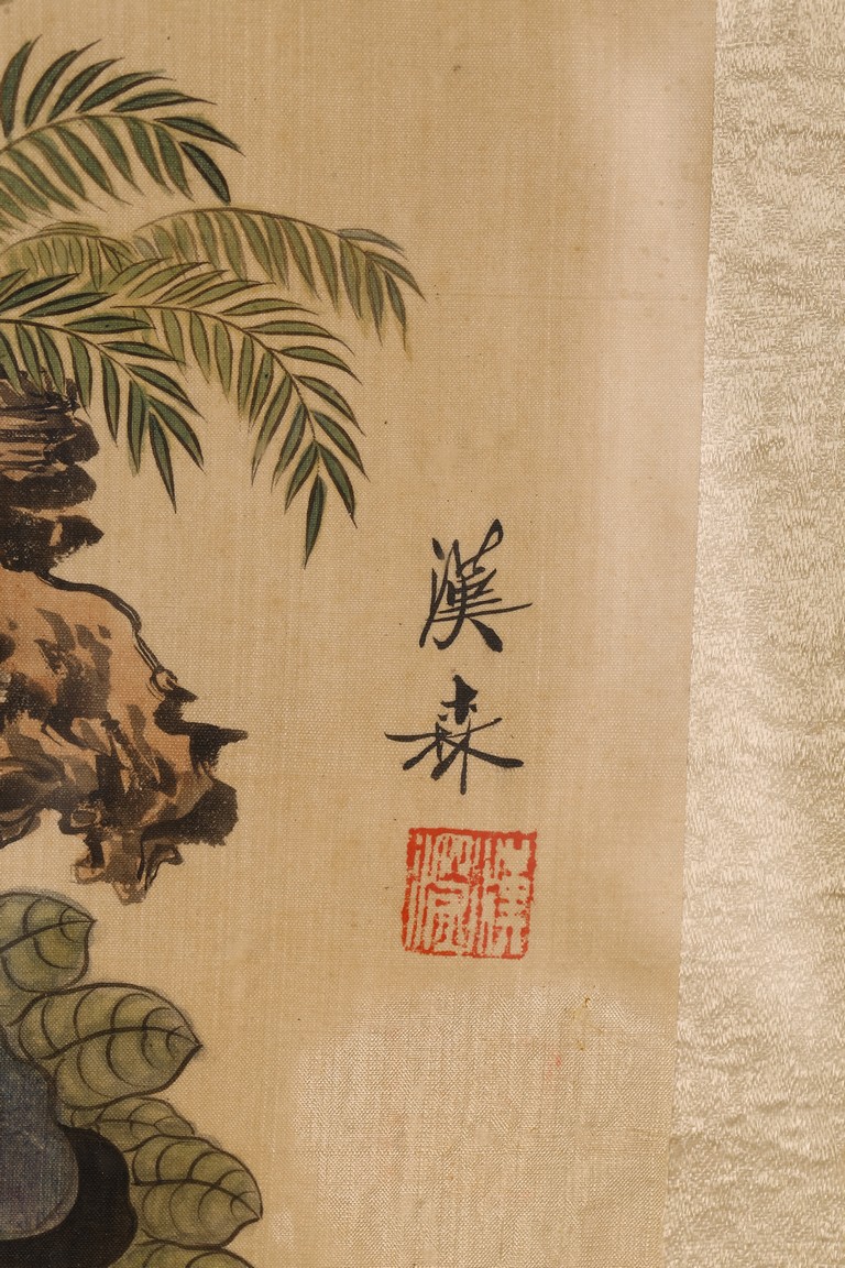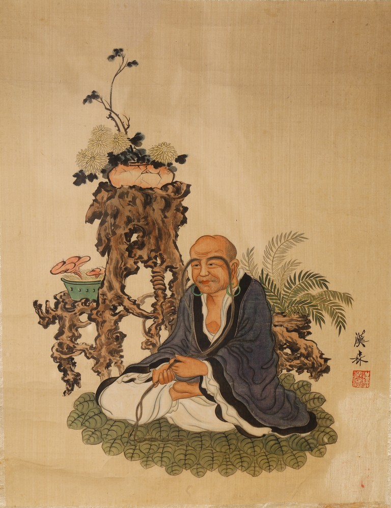 羅漢栩栩如生,令人觀之肅然起敬,身後隨型根幾,靈芝,菊草。落款:漢森,鈴印:漢森。