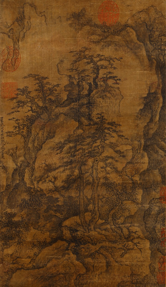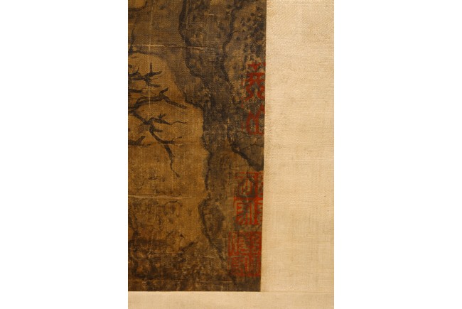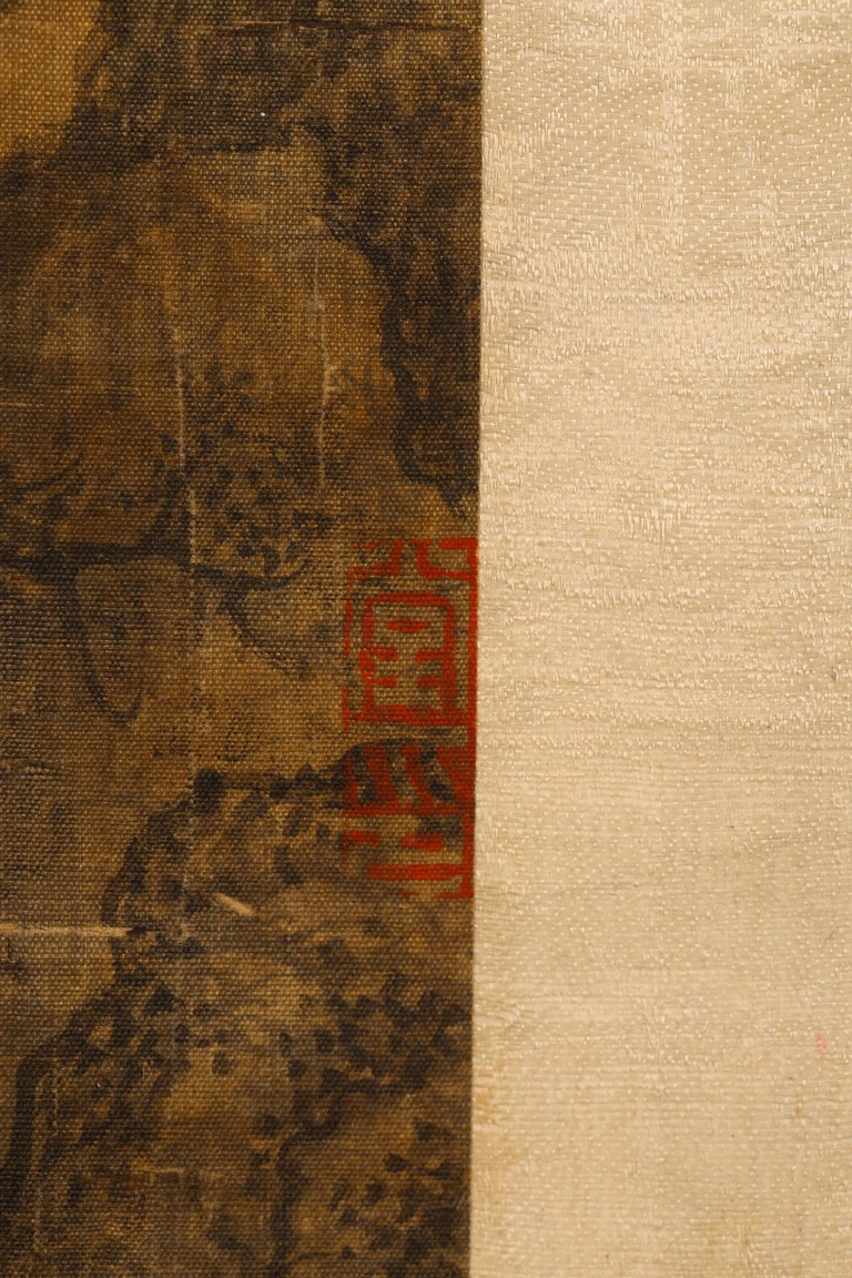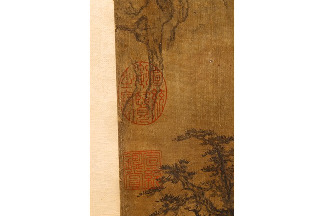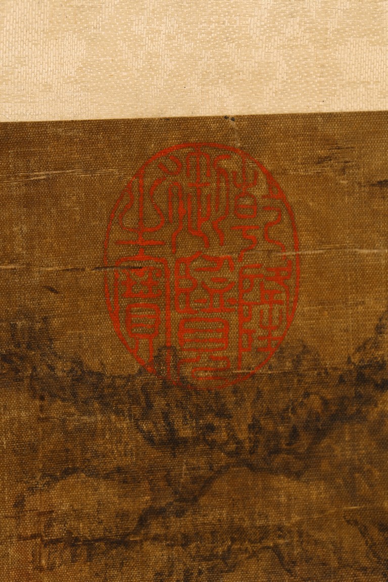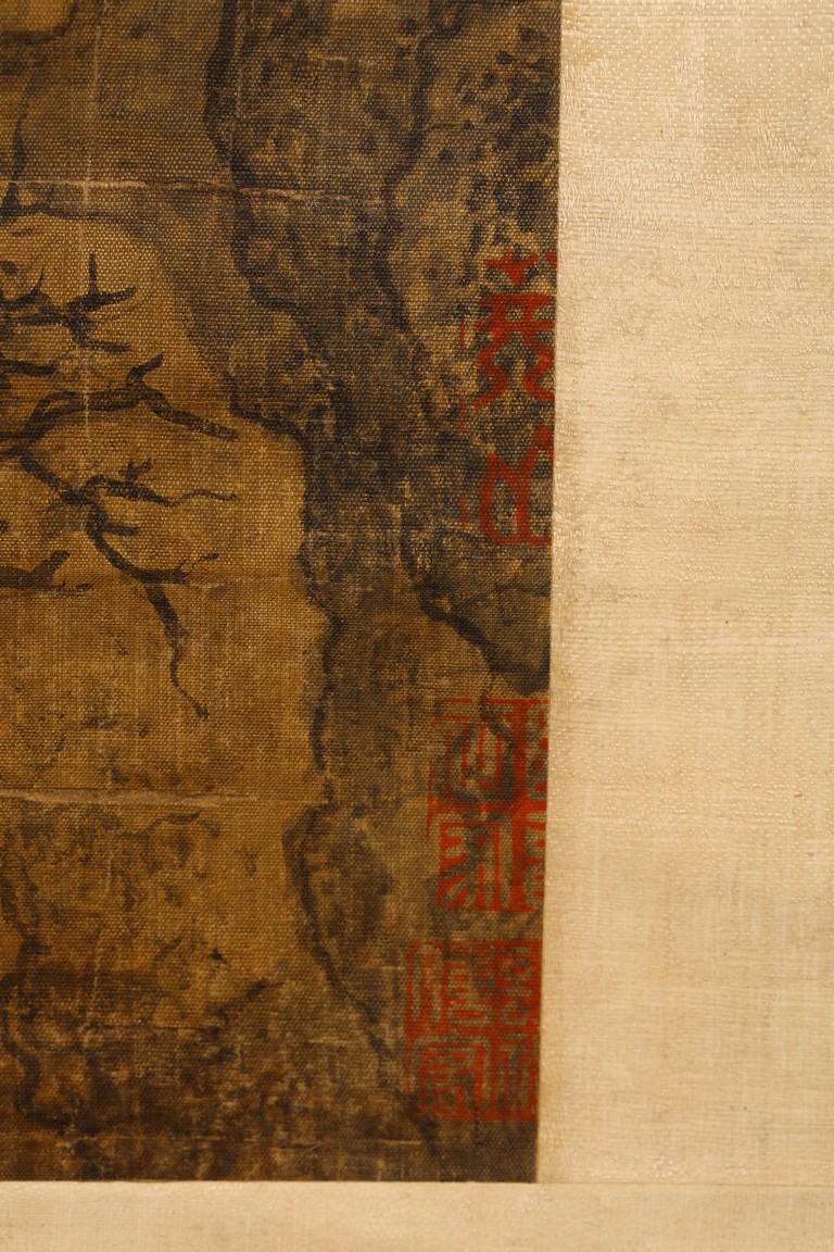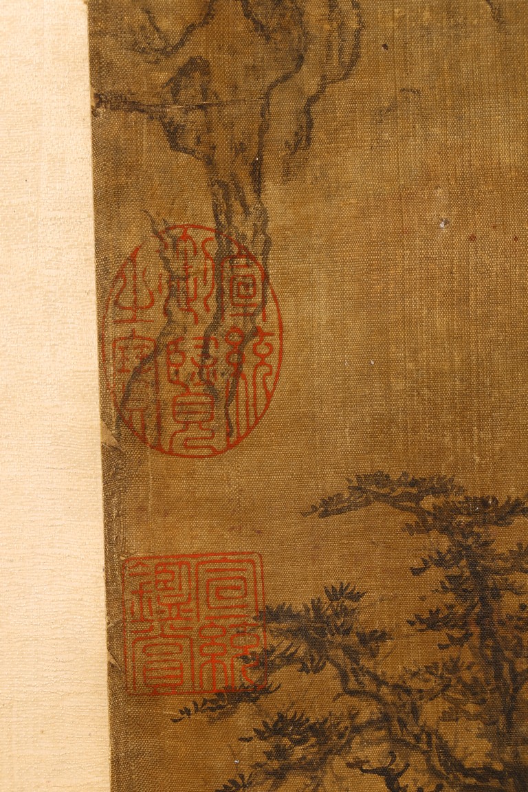 Chinese. Color and ink on silk. Landscape. Hanging scroll. Inscribed and signed, with seal marks.