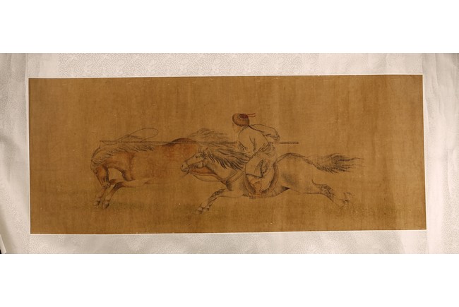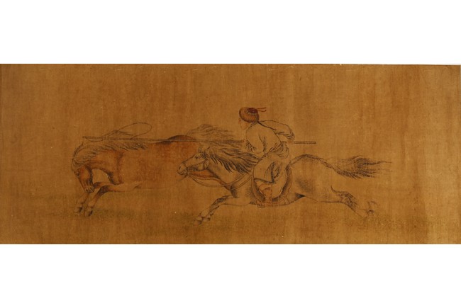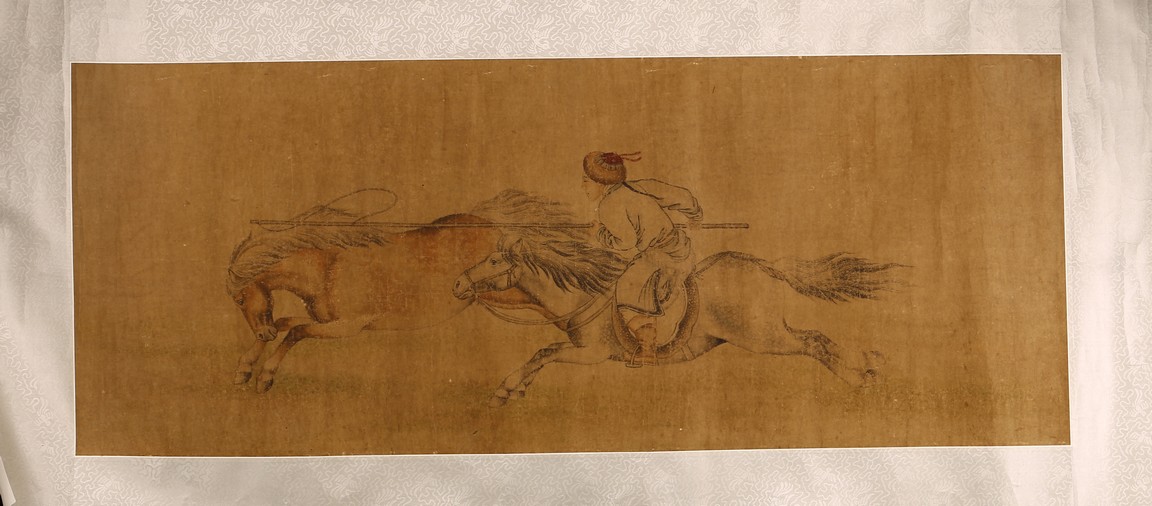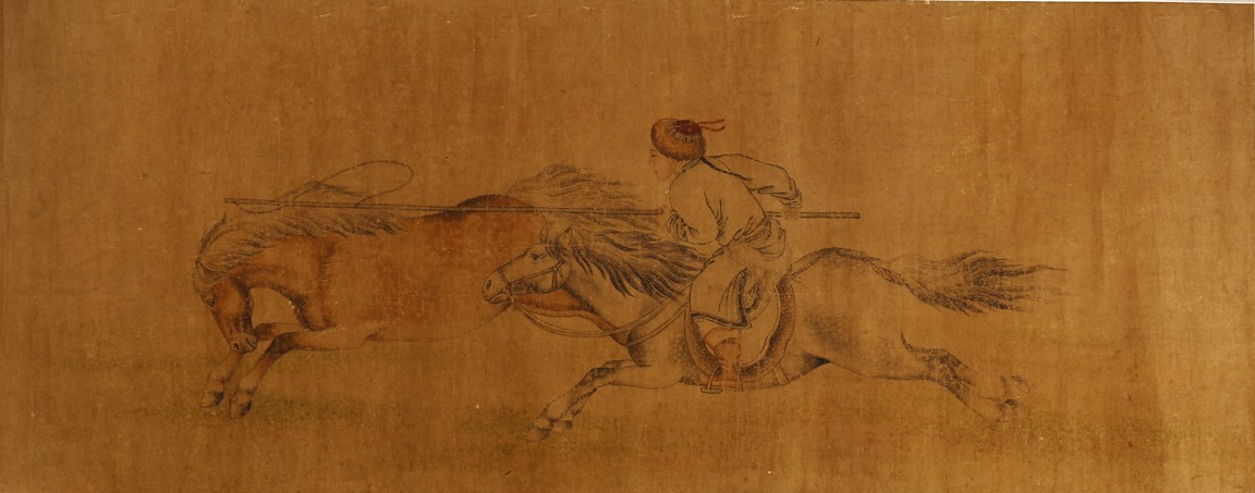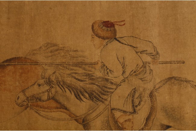 Chinese. Color and ink on paper. Hunting. Mounted on paper. Anonymous.