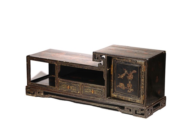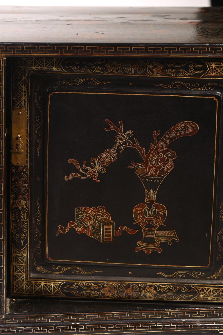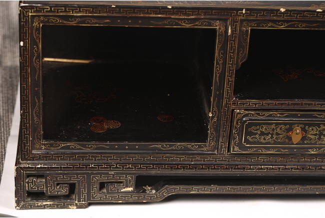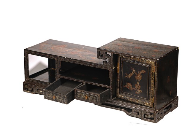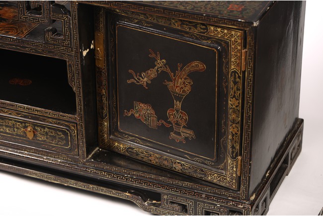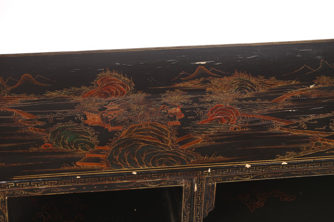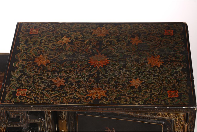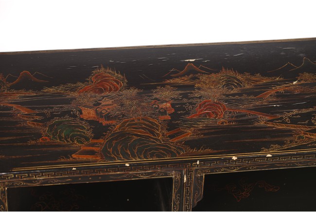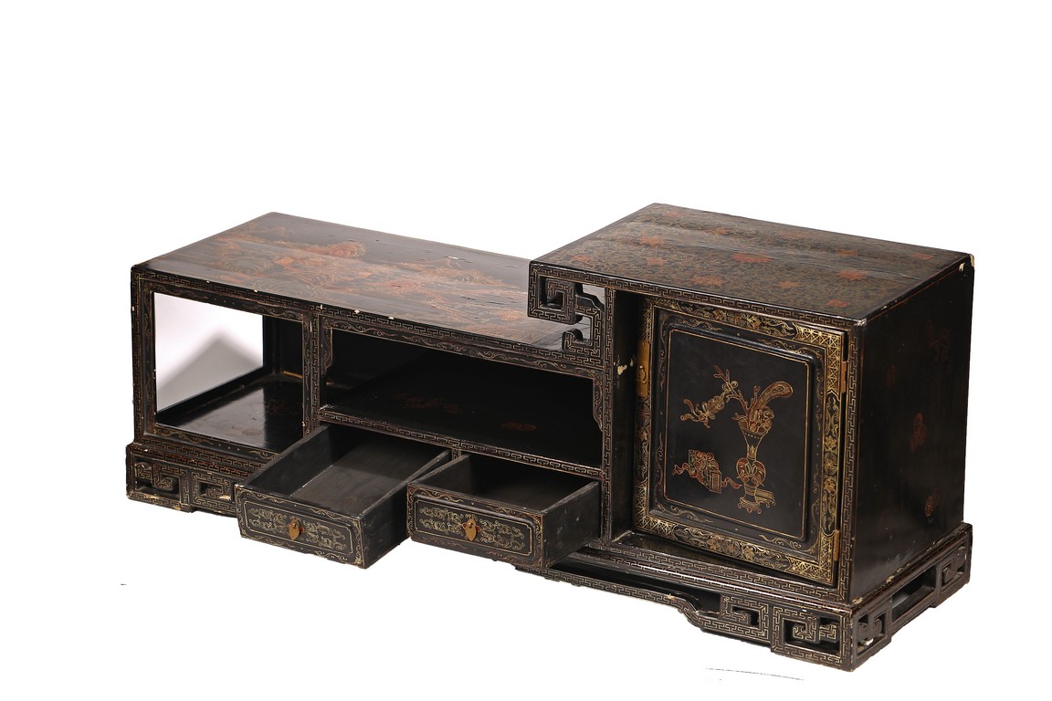 Chinese. Of horizontal form and divided into three compartments, with two drawers and a door, the top decorated with landscape scene. Qing Dynasty period.