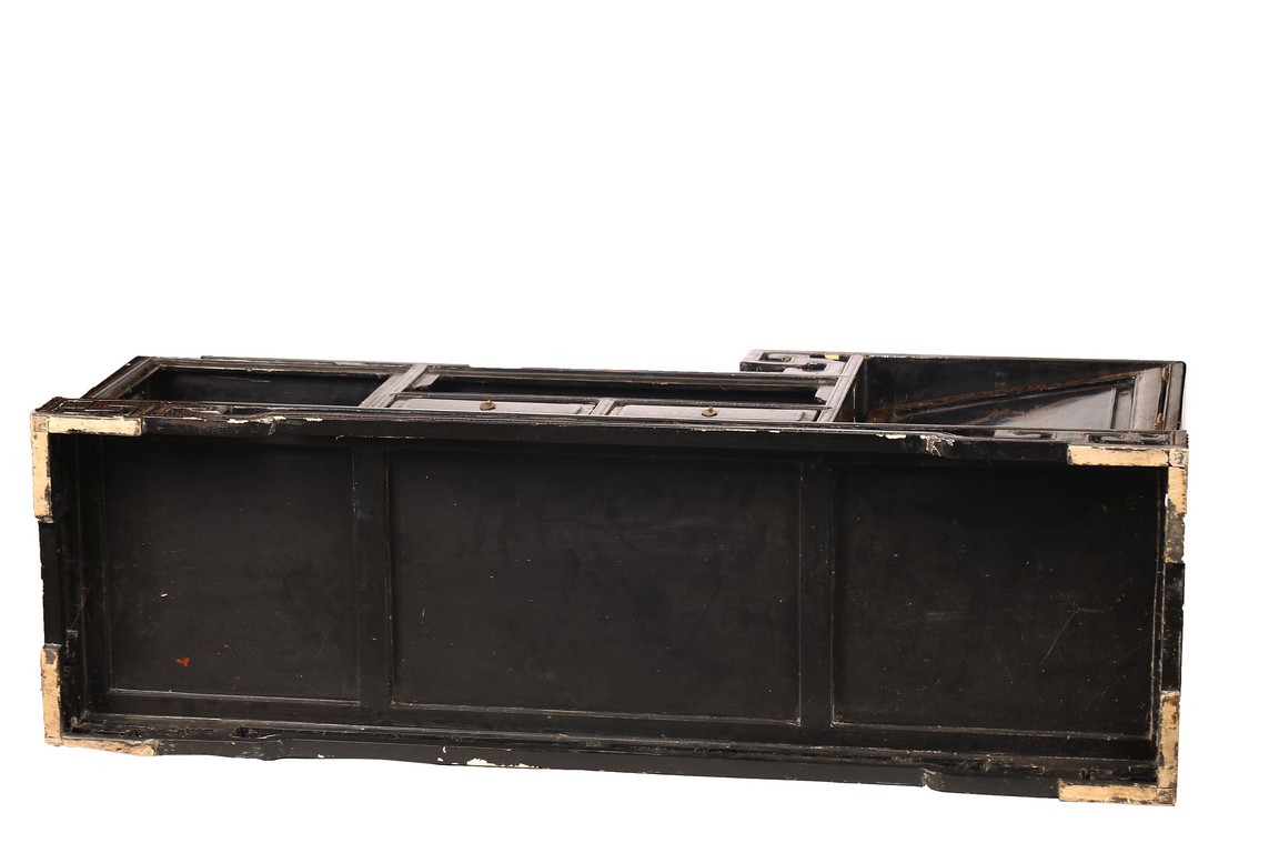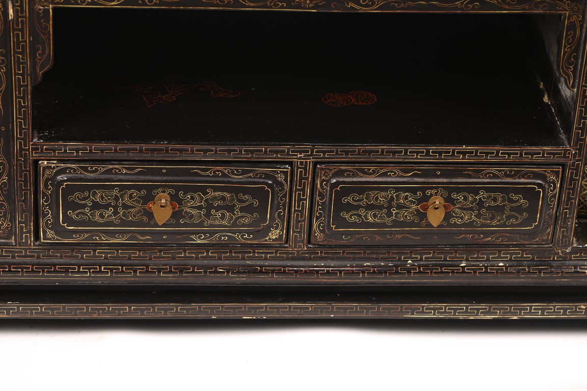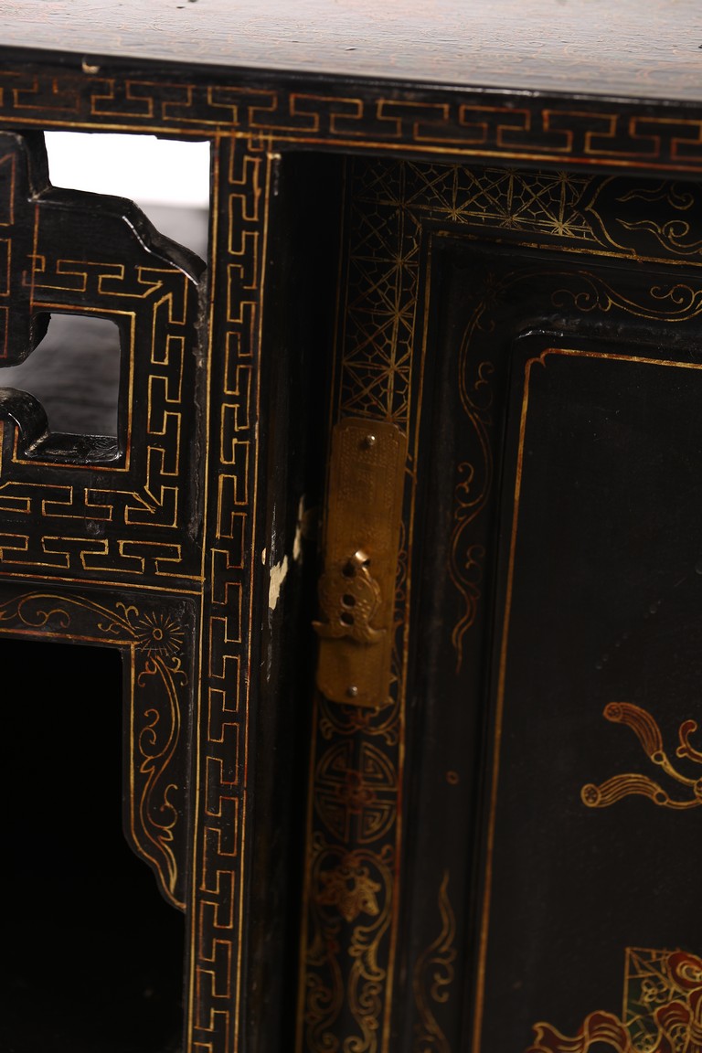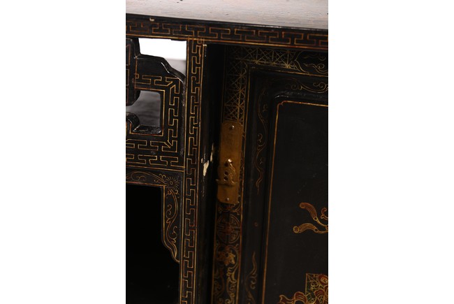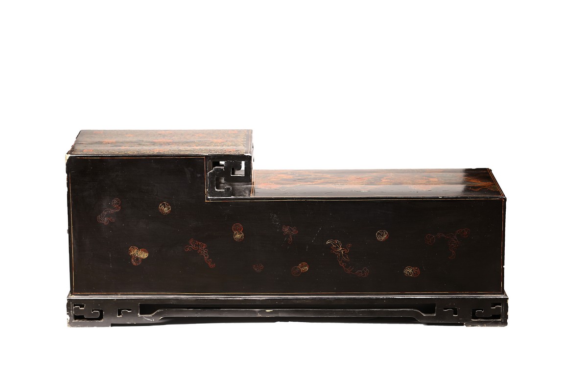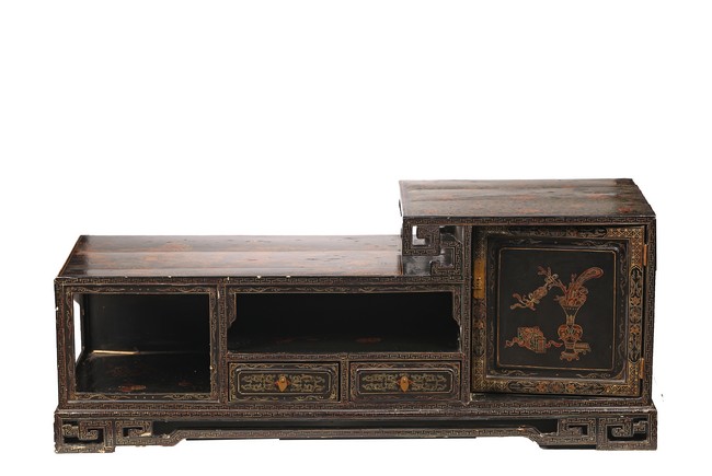 Chinese. Of horizontal form and divided into three compartments, with two drawers and a door, the top decorated with landscape scene. Qing Dynasty period.