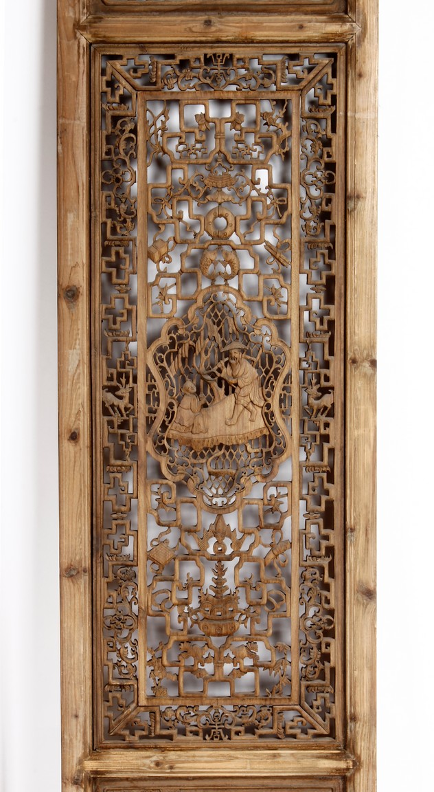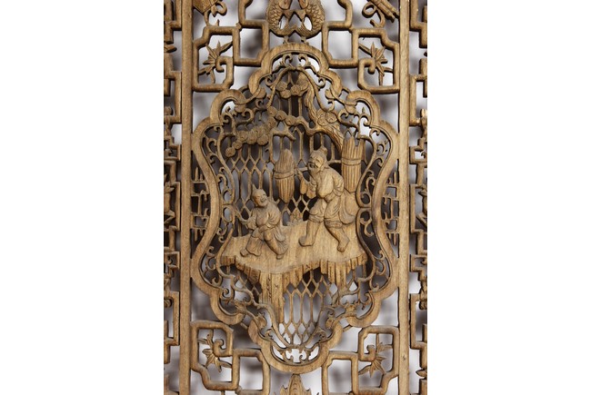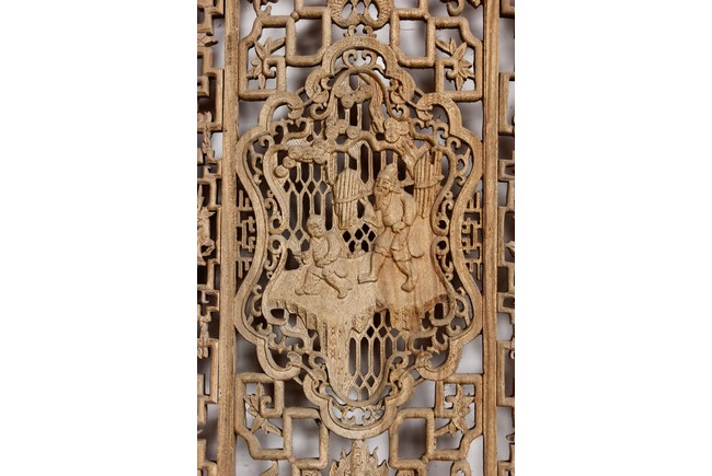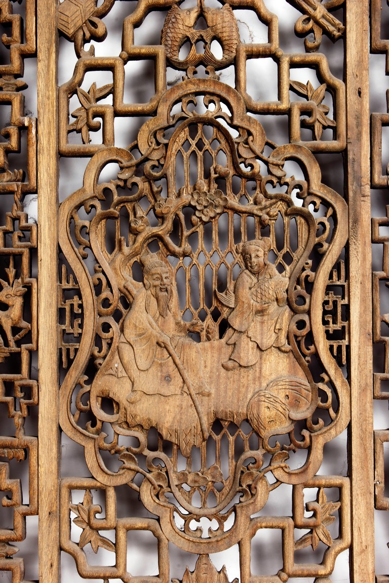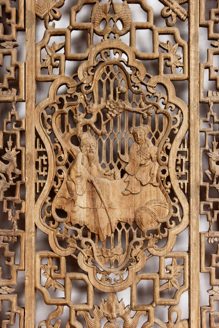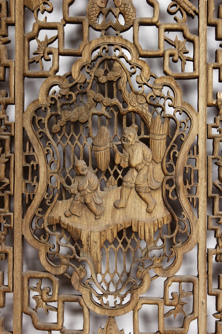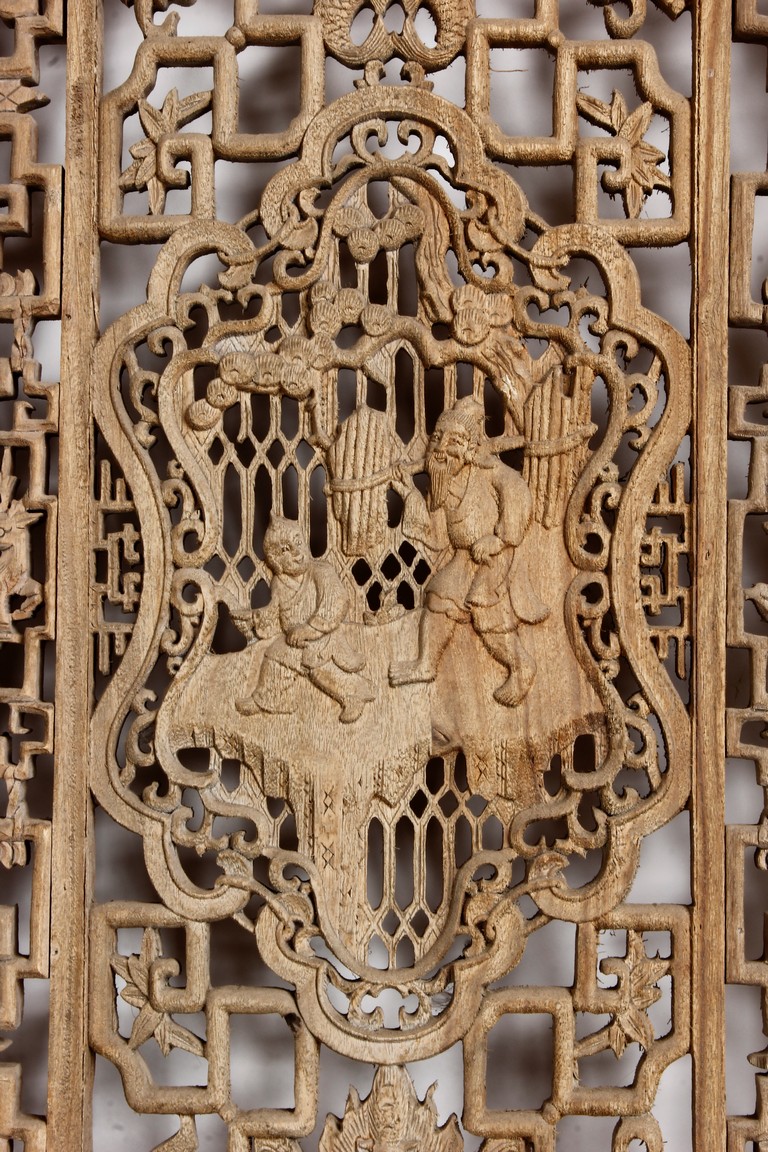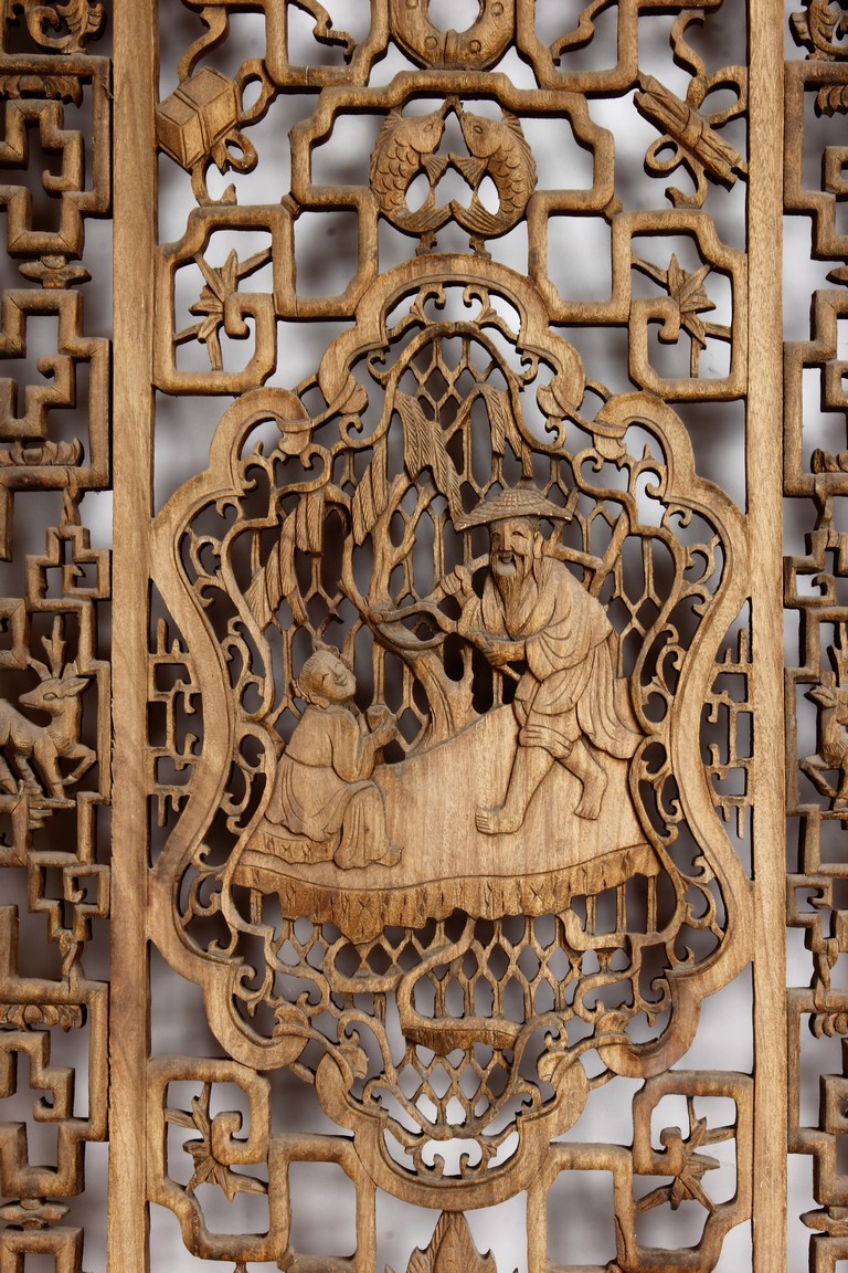 500" Each of rectangular form, the upper panel carved and pierced with intricate patterns and a stylized 'shou' character, the middle section elegantly pierced with figures flanked by auspicious motifs and key-fret patterns. The lower section carved in relief with figures from stories. Qing Dynasty period.