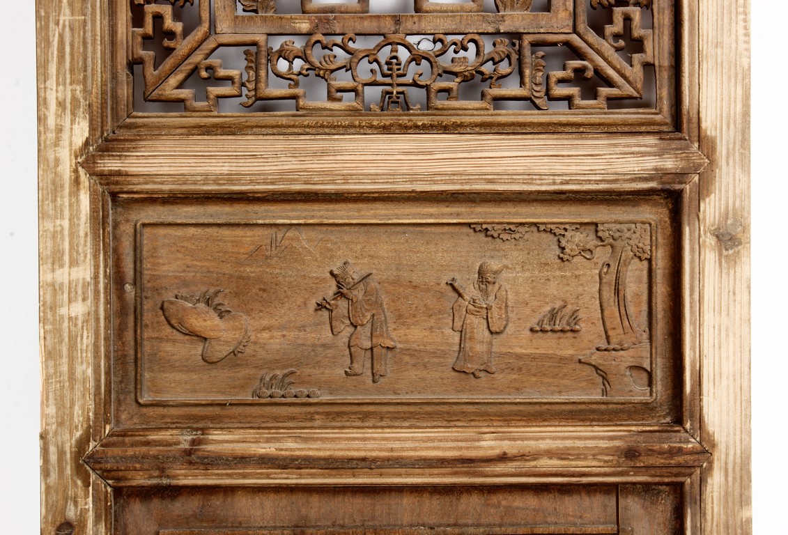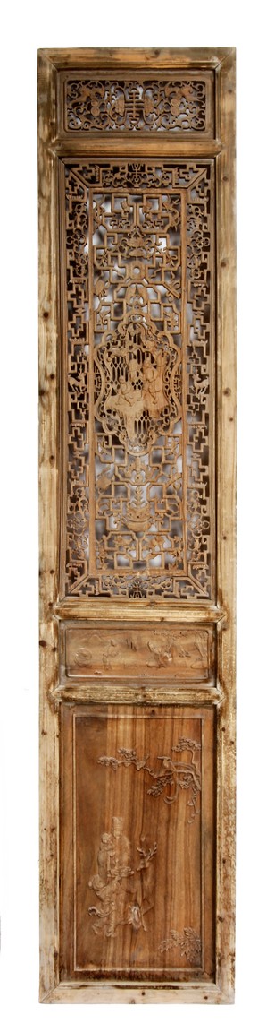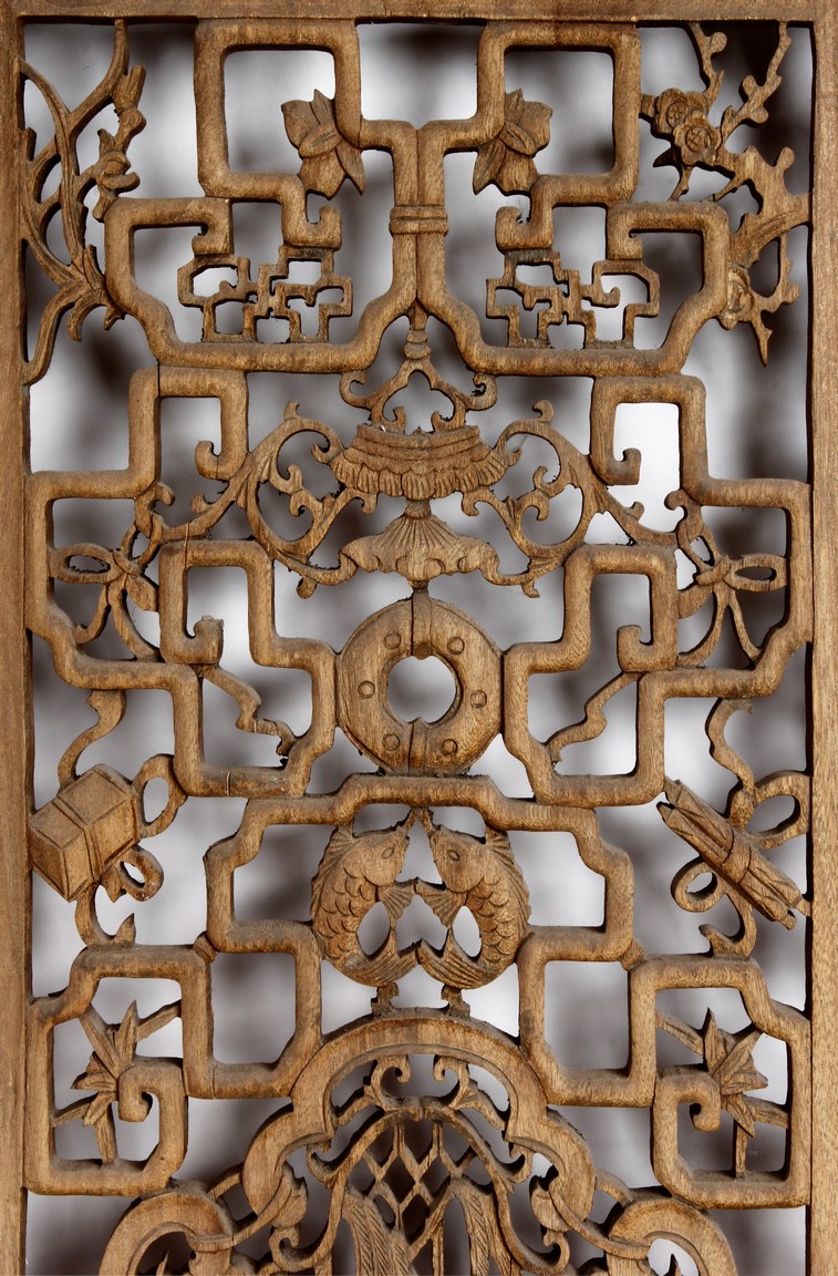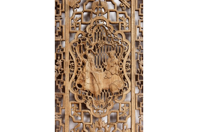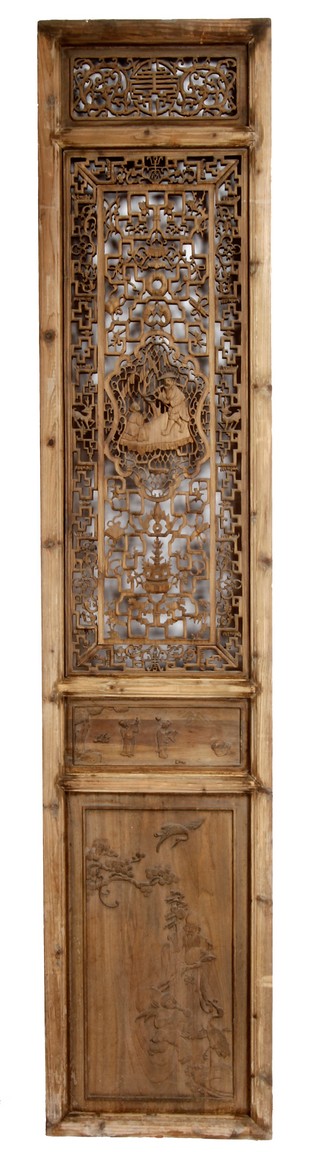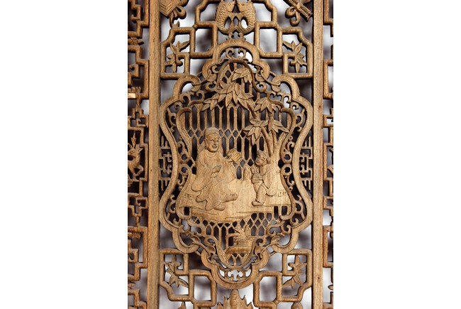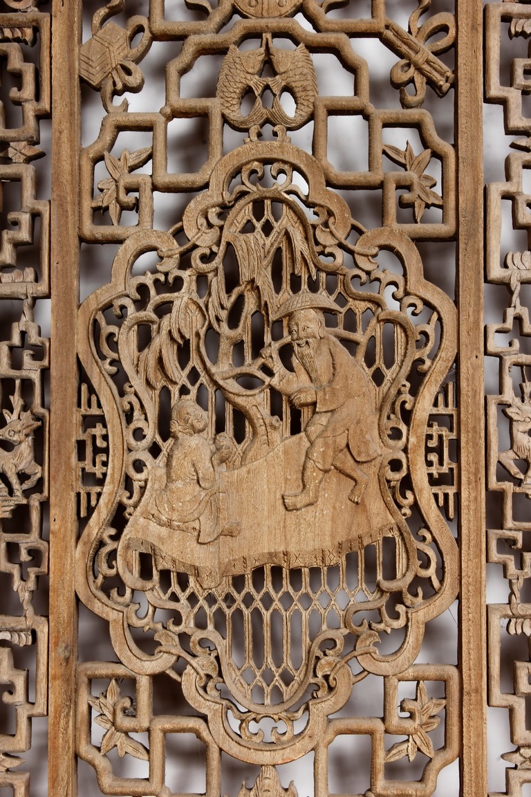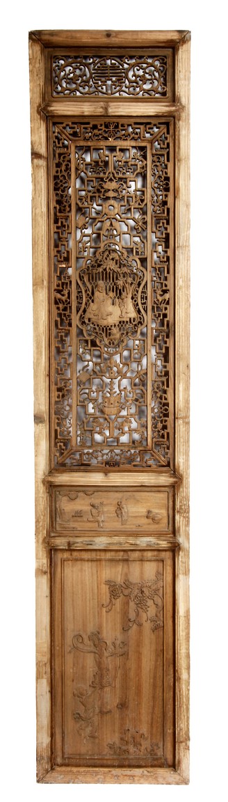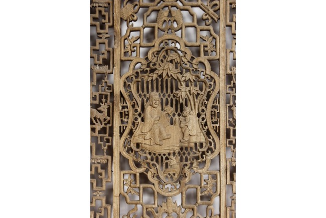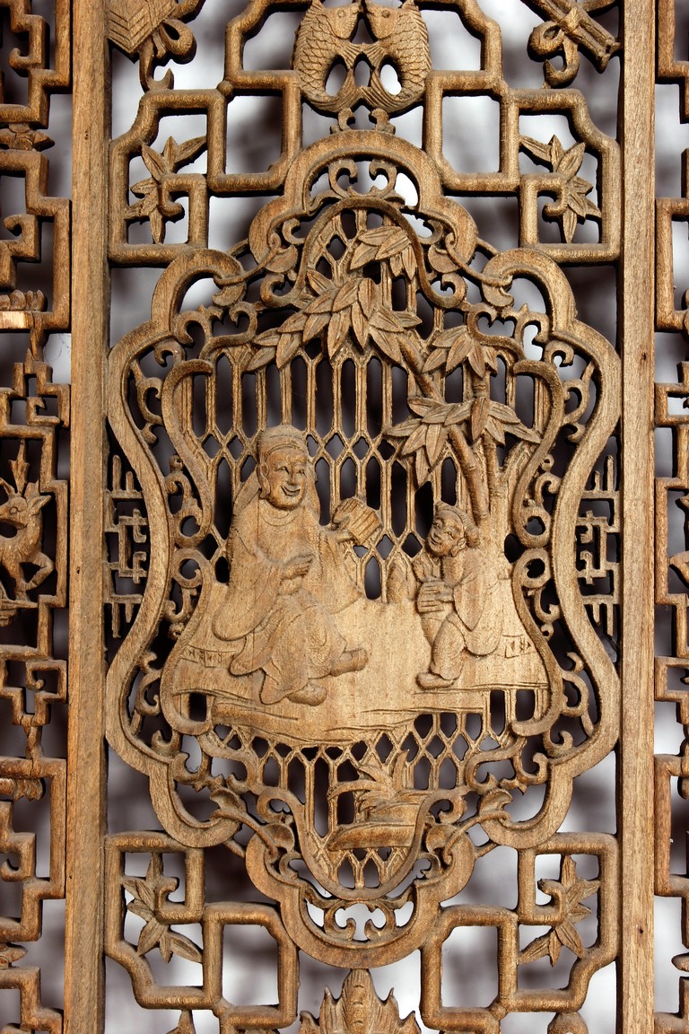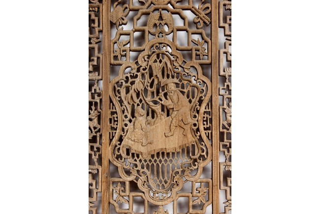 500" Each of rectangular form, the upper panel carved and pierced with intricate patterns and a stylized 'shou' character, the middle section elegantly pierced with figures flanked by auspicious motifs and key-fret patterns. The lower section carved in relief with figures from stories. Qing Dynasty period.