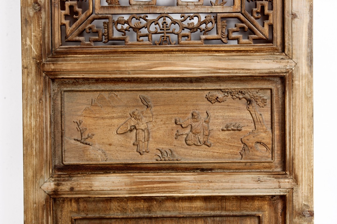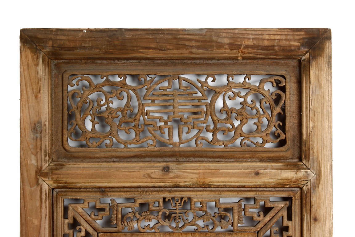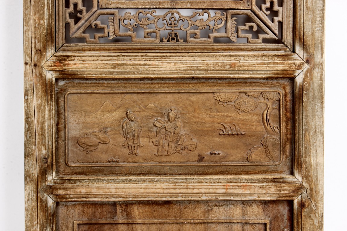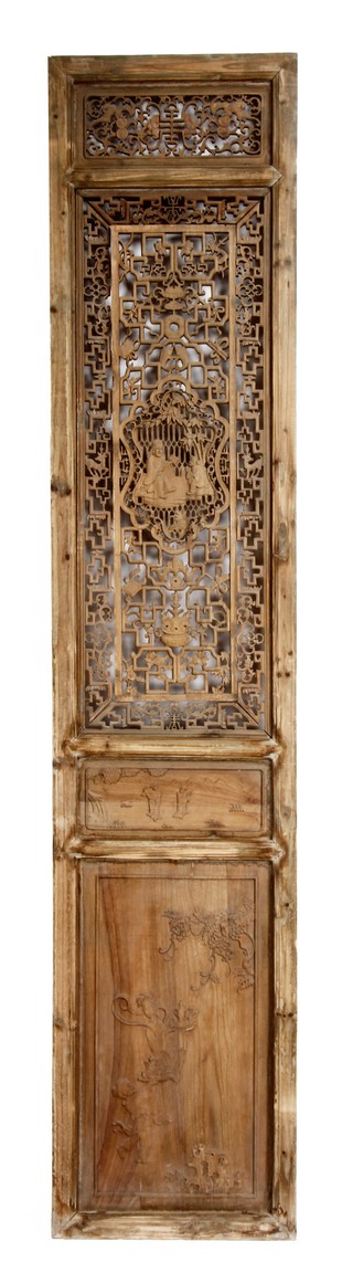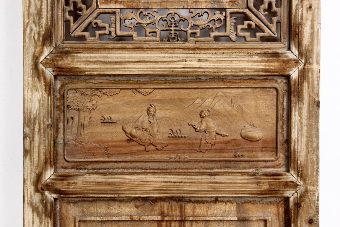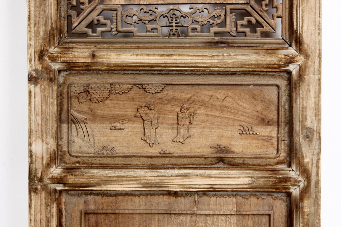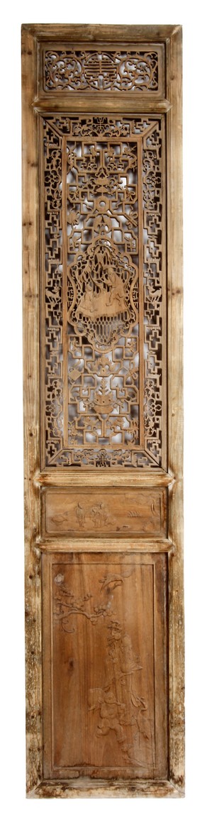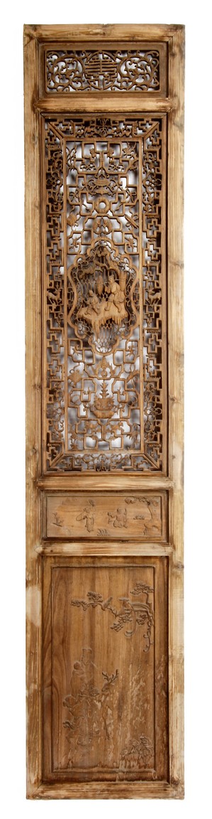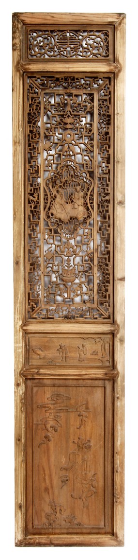 500" Each of rectangular form, the upper panel carved and pierced with intricate patterns and a stylized 'shou' character, the middle section elegantly pierced with figures flanked by auspicious motifs and key-fret patterns. The lower section carved in relief with figures from stories. Qing Dynasty period.