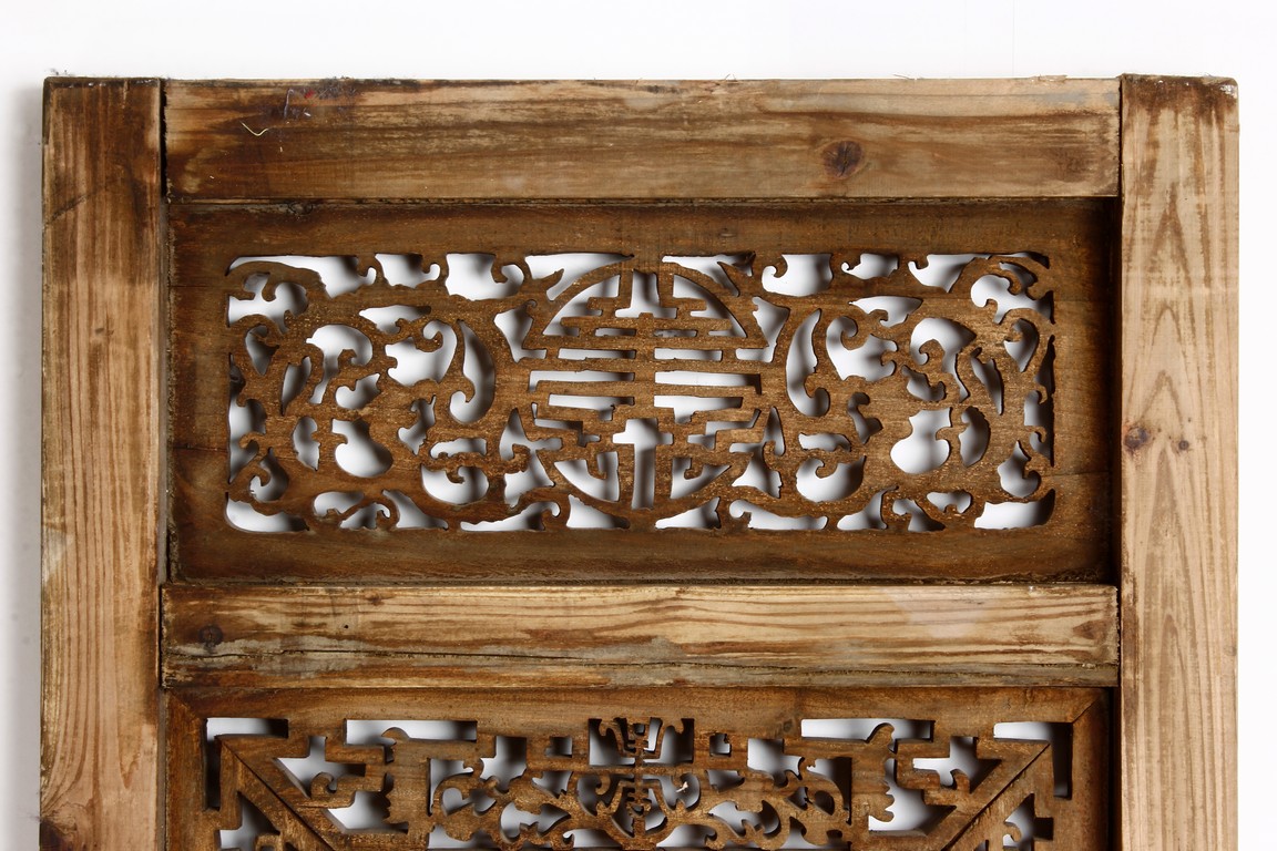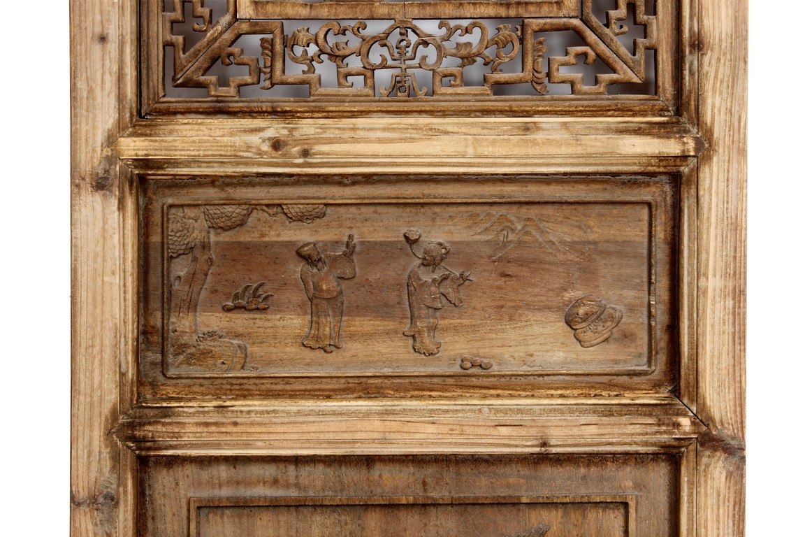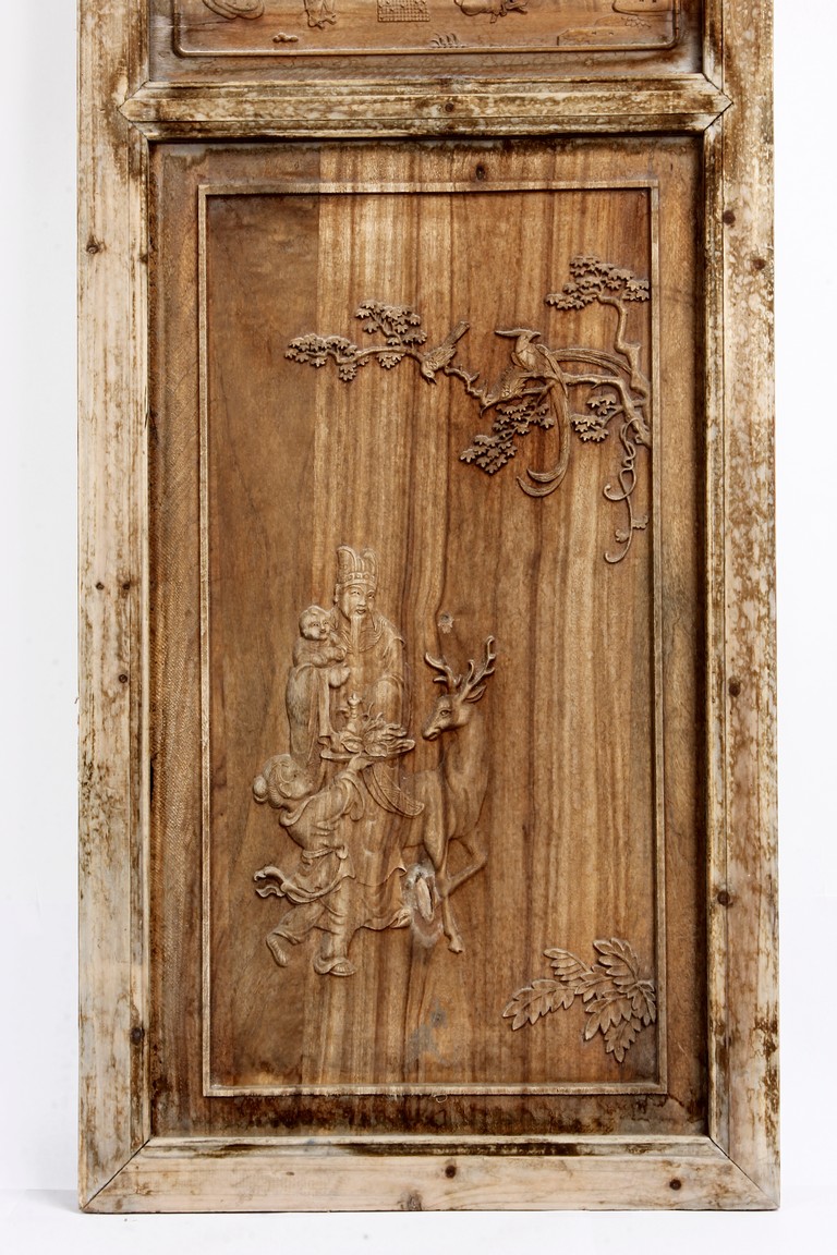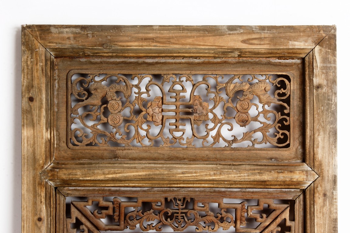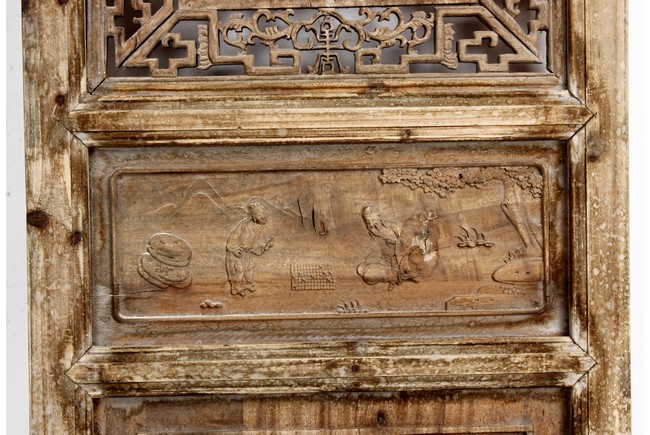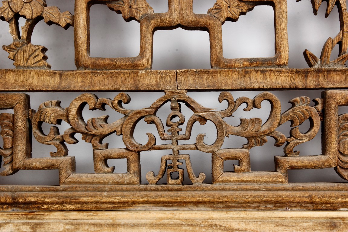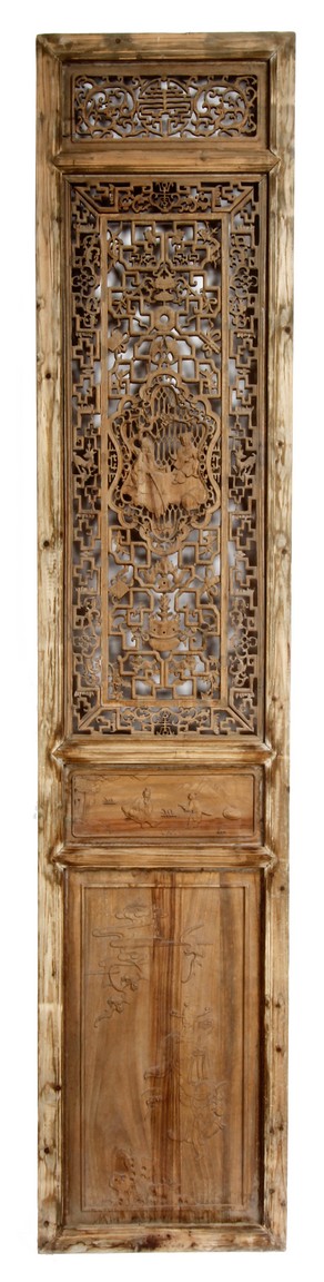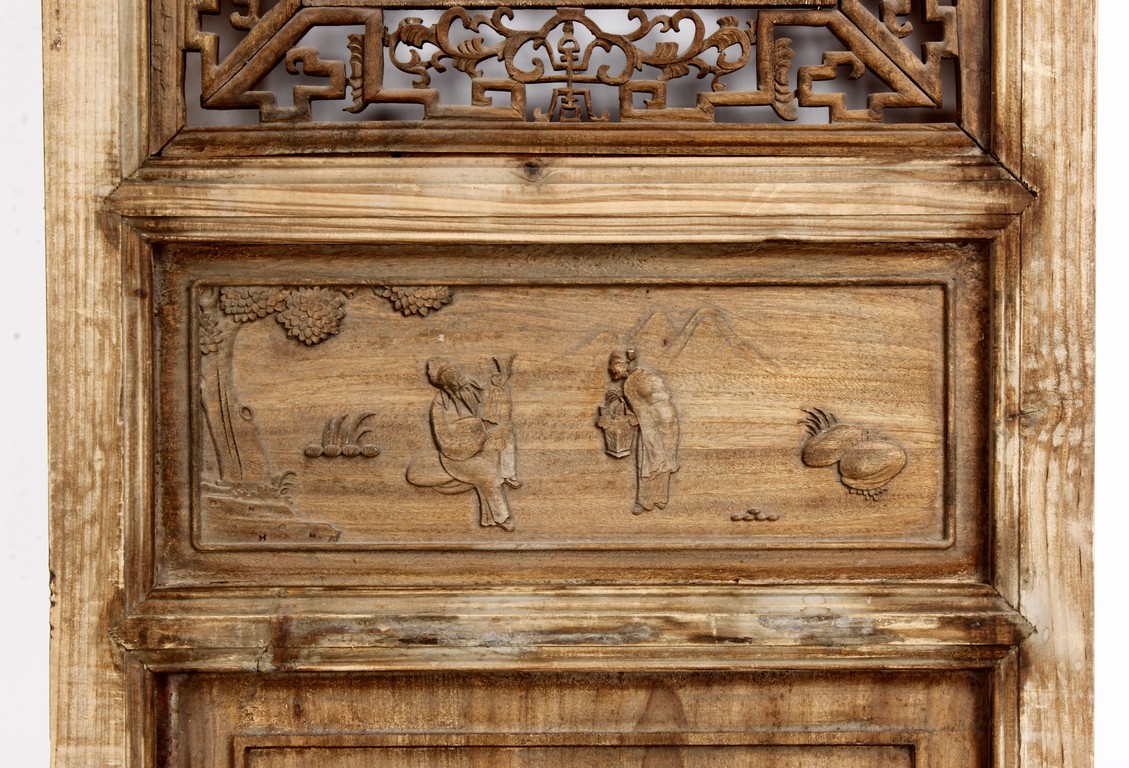 500" Each of rectangular form, the upper panel carved and pierced with intricate patterns and a stylized 'shou' character, the middle section elegantly pierced with figures flanked by auspicious motifs and key-fret patterns. The lower section carved in relief with figures from stories. Qing Dynasty period.