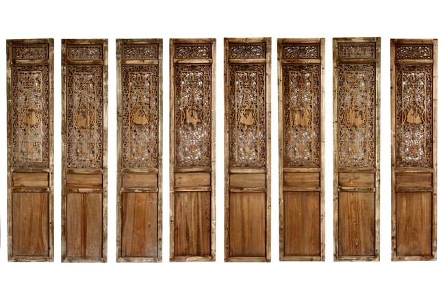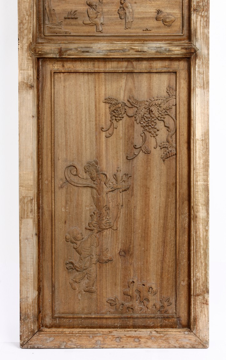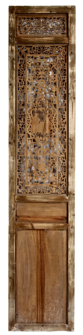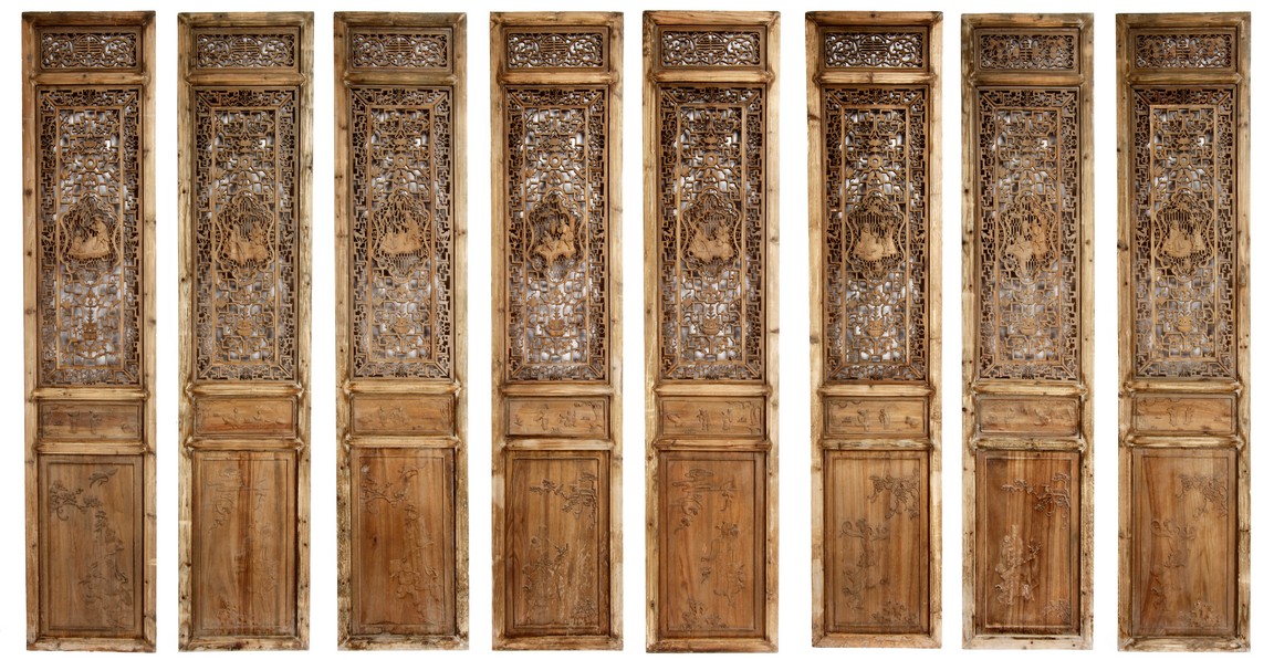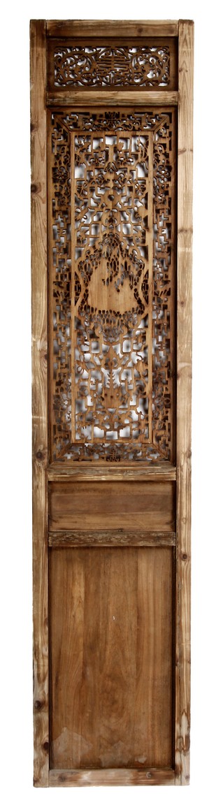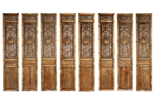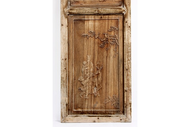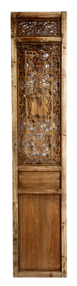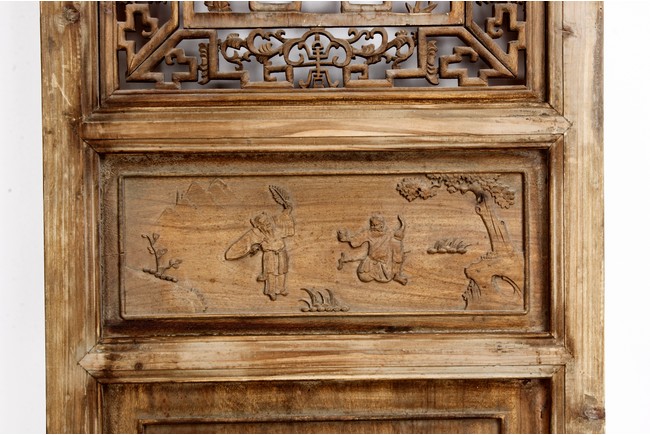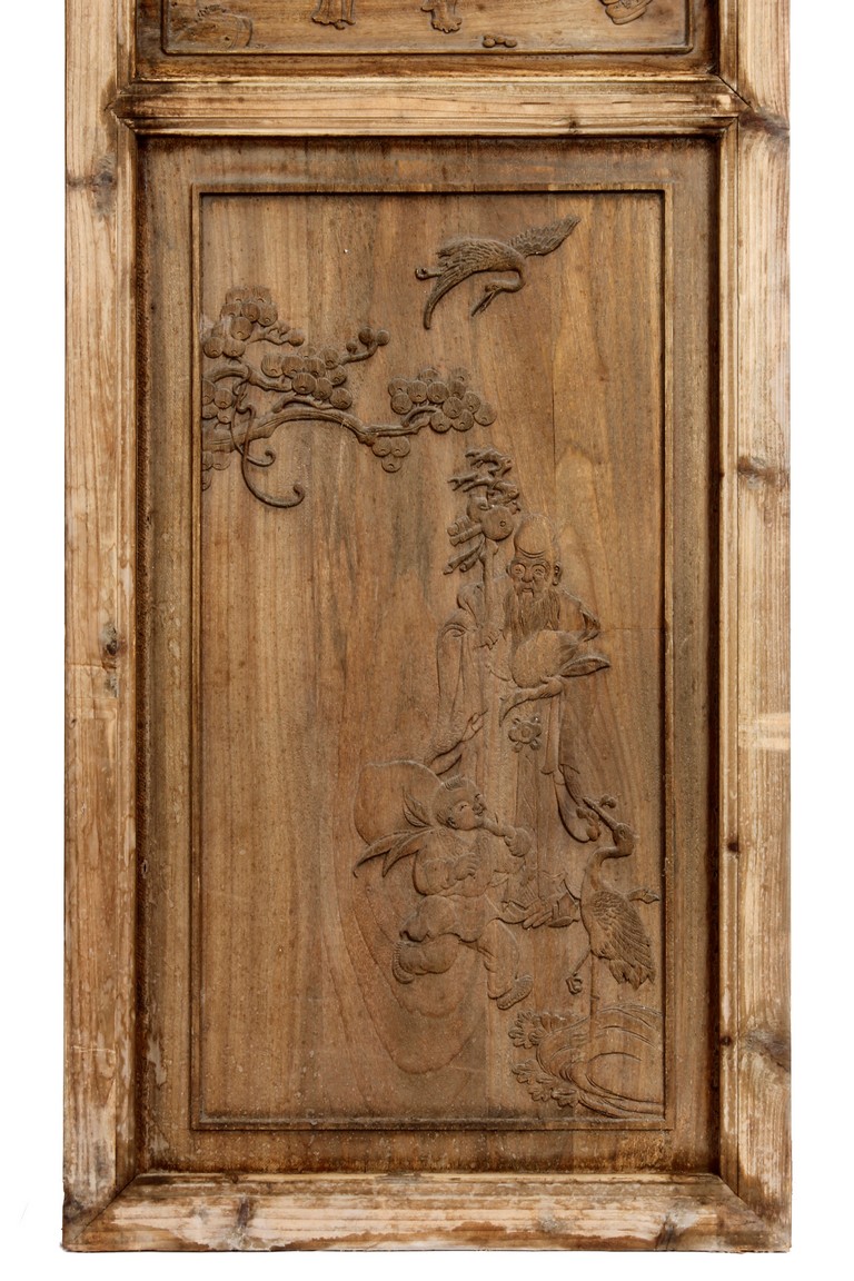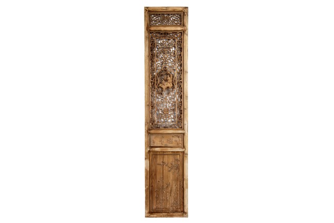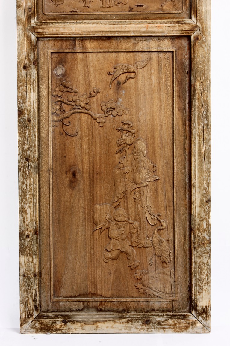 500" Each of rectangular form, the upper panel carved and pierced with intricate patterns and a stylized 'shou' character, the middle section elegantly pierced with figures flanked by auspicious motifs and key-fret patterns. The lower section carved in relief with figures from stories. Qing Dynasty period.