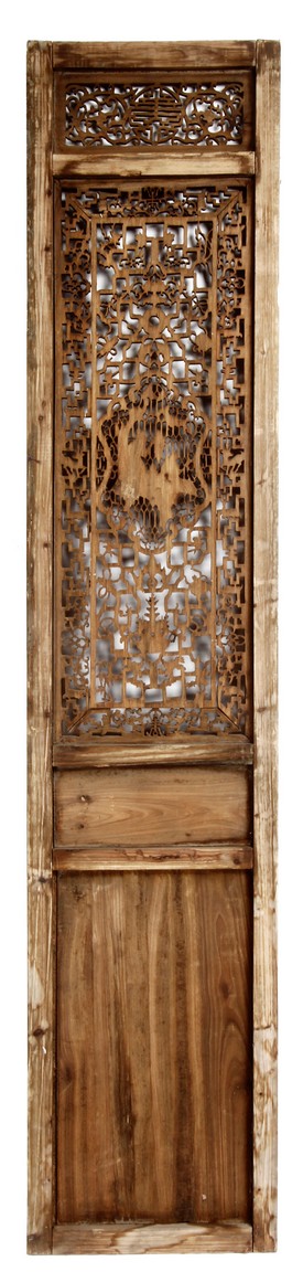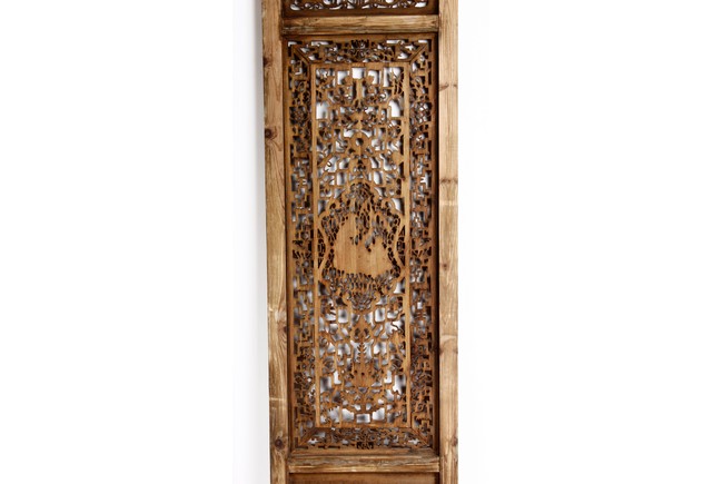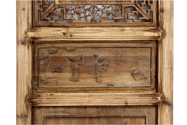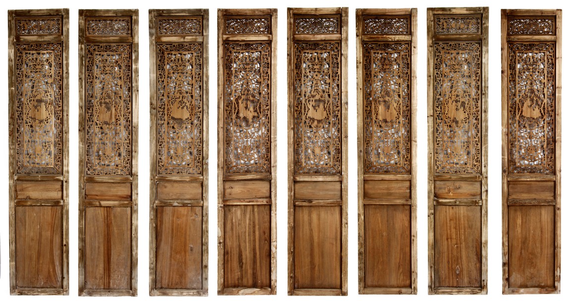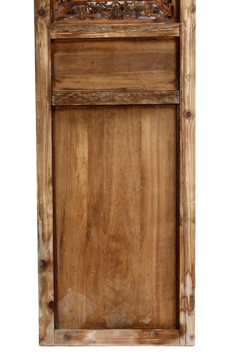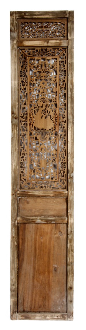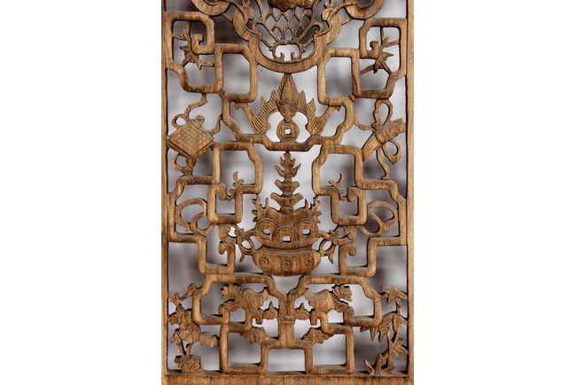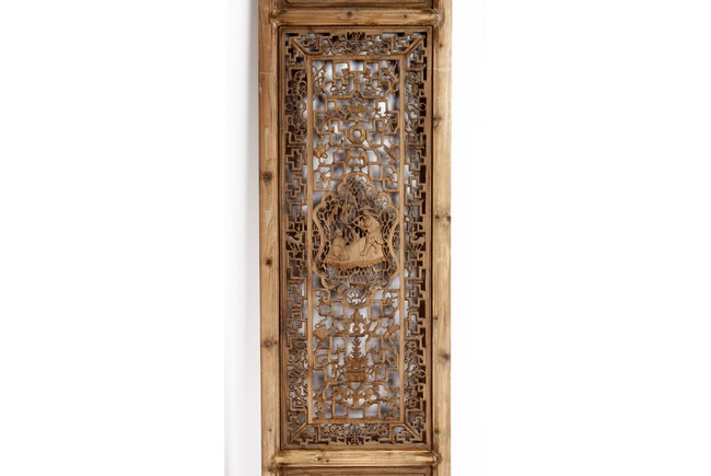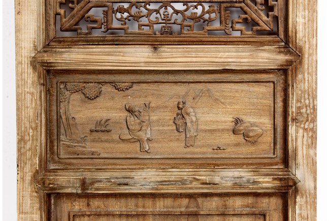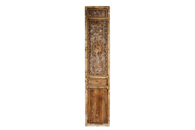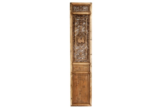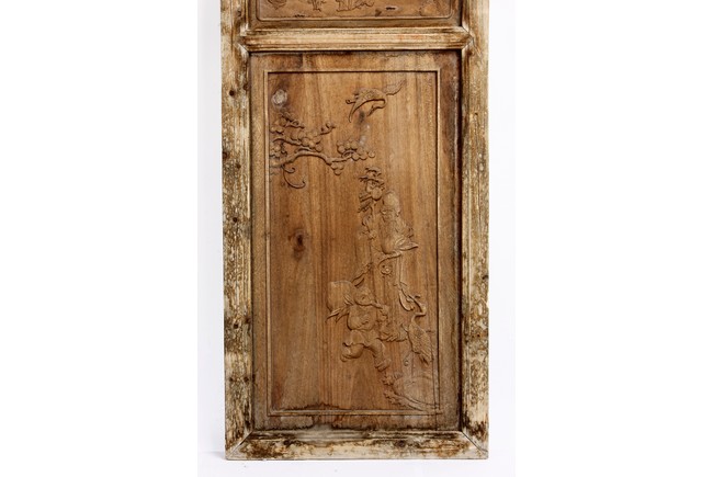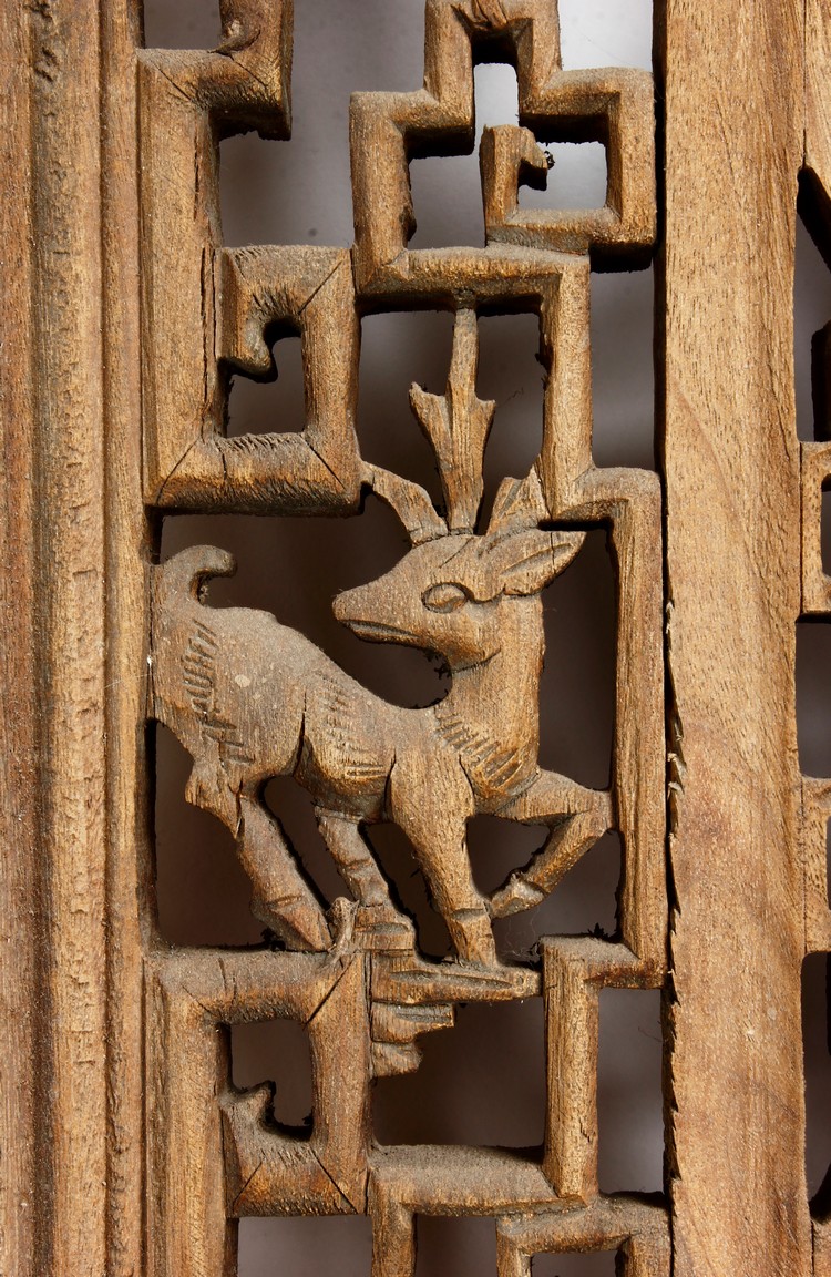 500" Each of rectangular form, the upper panel carved and pierced with intricate patterns and a stylized 'shou' character, the middle section elegantly pierced with figures flanked by auspicious motifs and key-fret patterns. The lower section carved in relief with figures from stories. Qing Dynasty period.