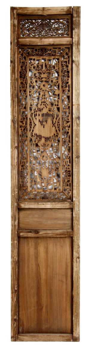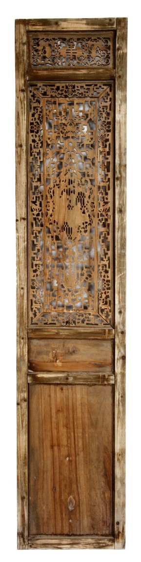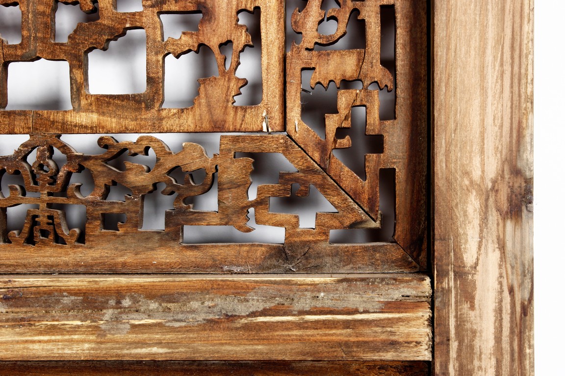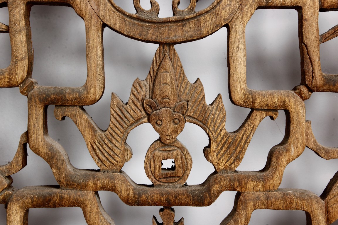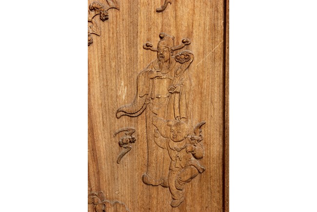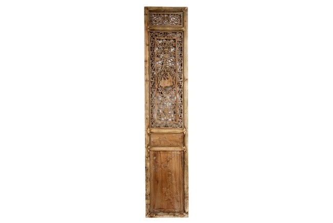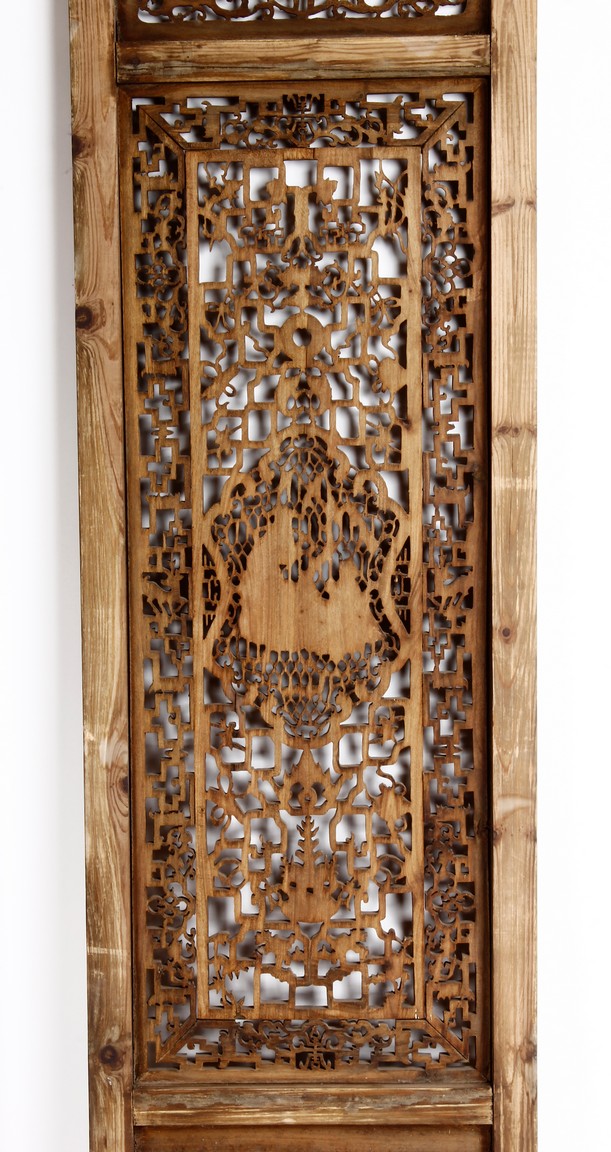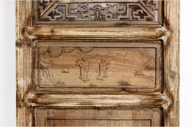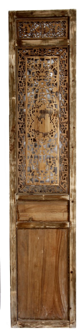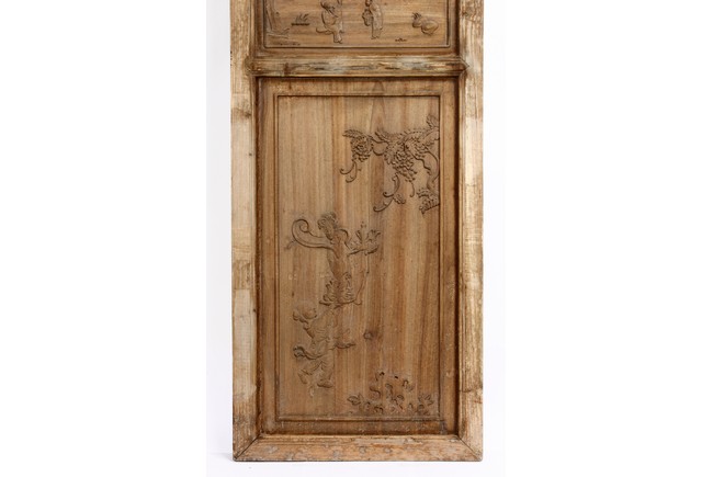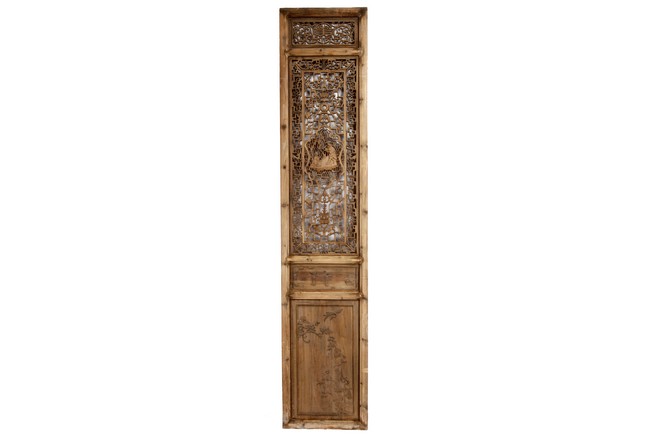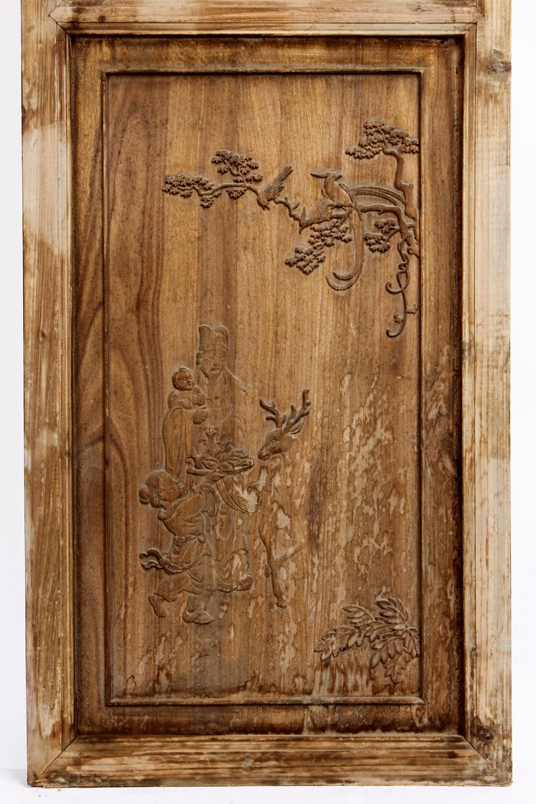 500" Each of rectangular form, the upper panel carved and pierced with intricate patterns and a stylized 'shou' character, the middle section elegantly pierced with figures flanked by auspicious motifs and key-fret patterns. The lower section carved in relief with figures from stories. Qing Dynasty period.