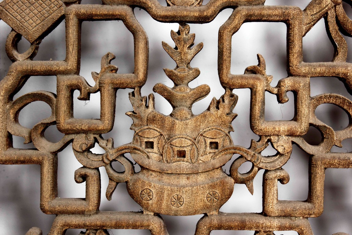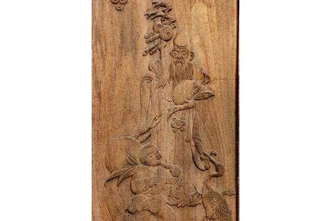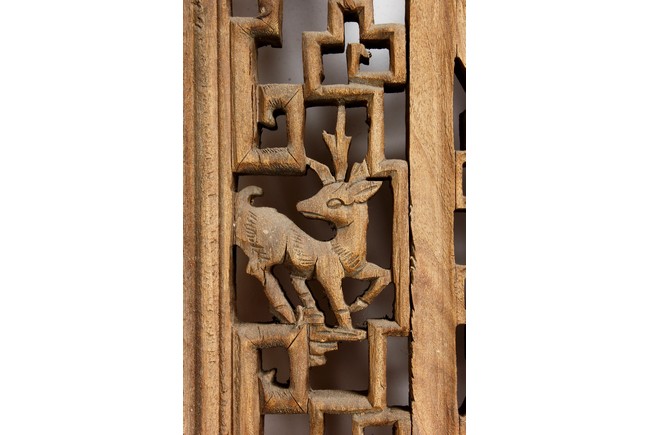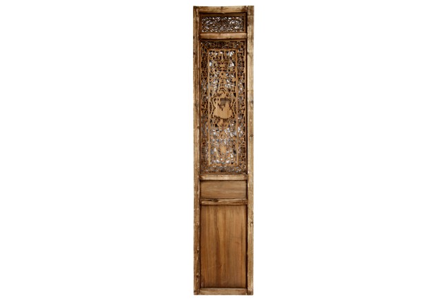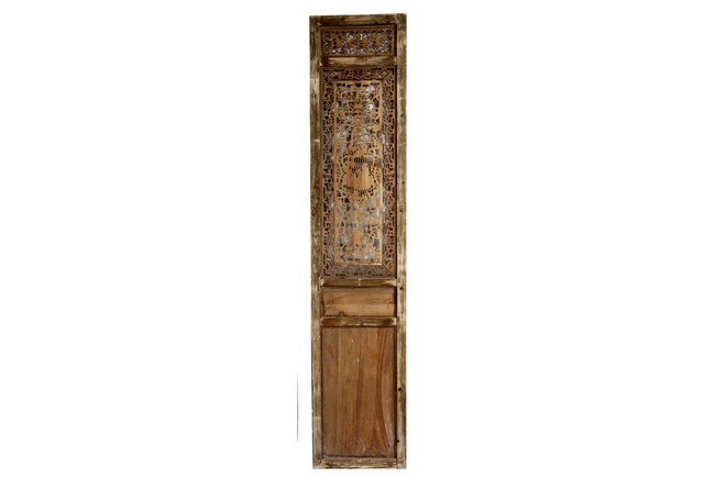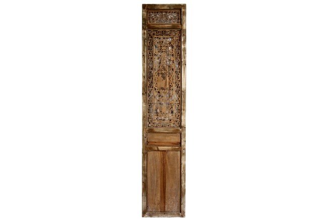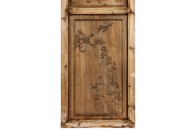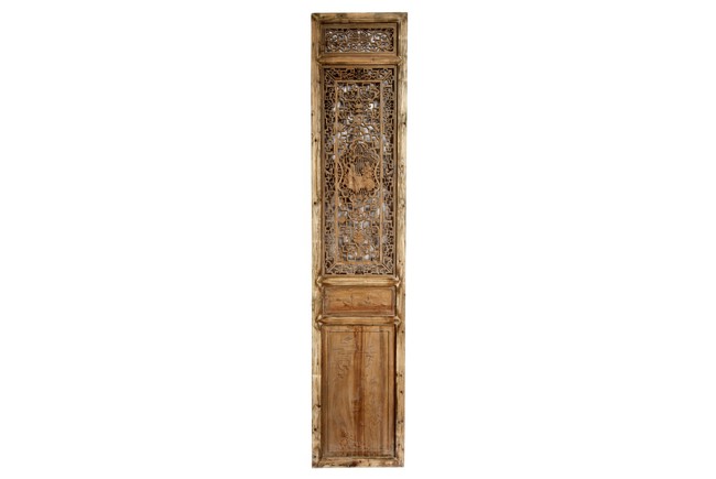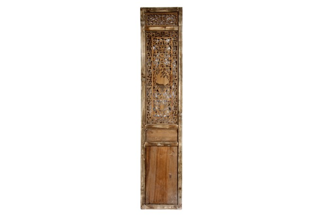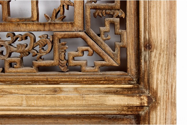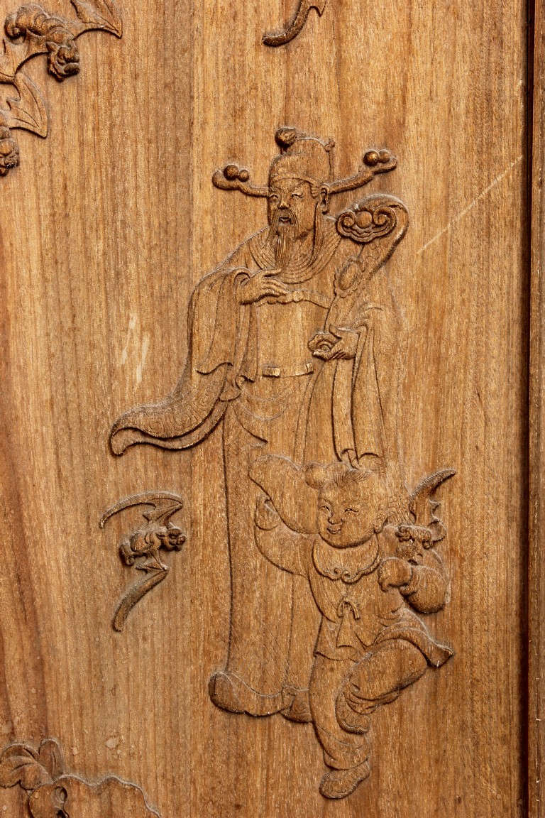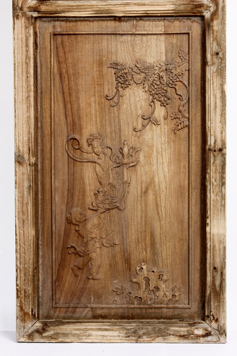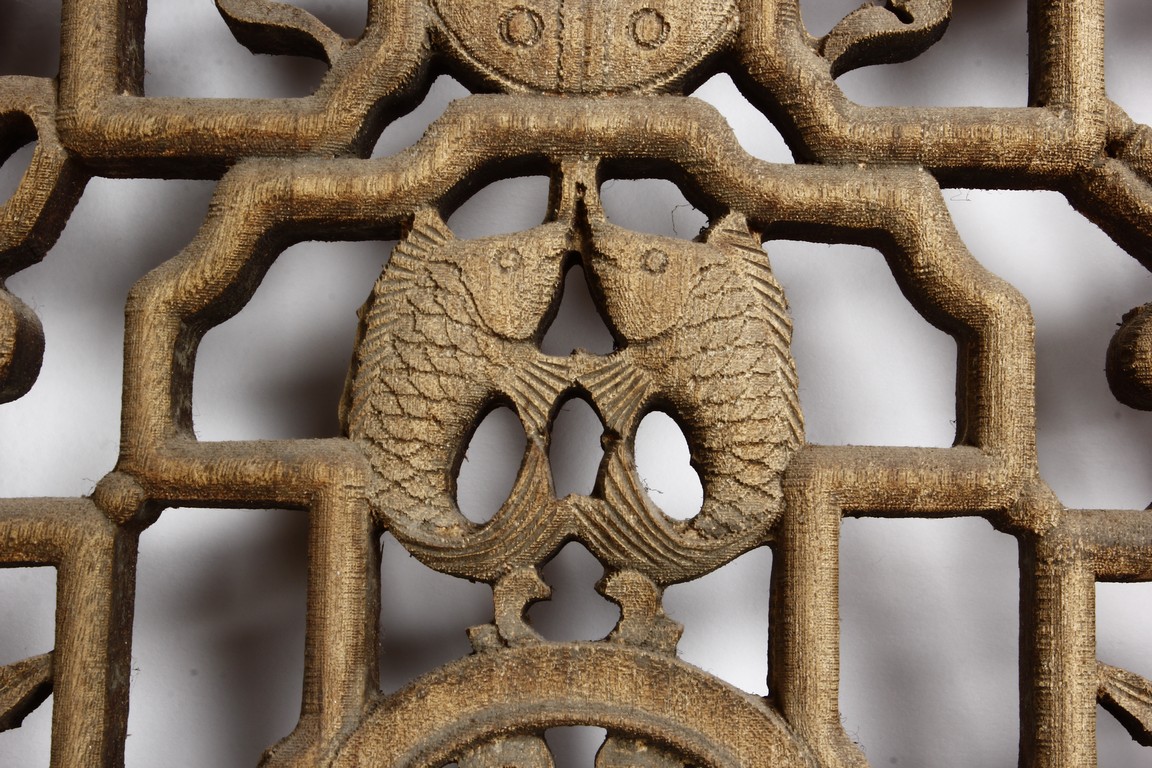 500" Each of rectangular form, the upper panel carved and pierced with intricate patterns and a stylized 'shou' character, the middle section elegantly pierced with figures flanked by auspicious motifs and key-fret patterns. The lower section carved in relief with figures from stories. Qing Dynasty period.