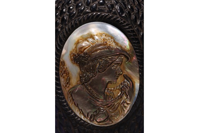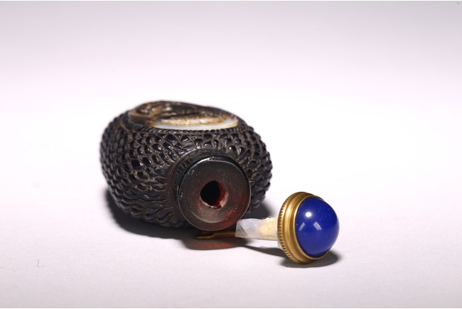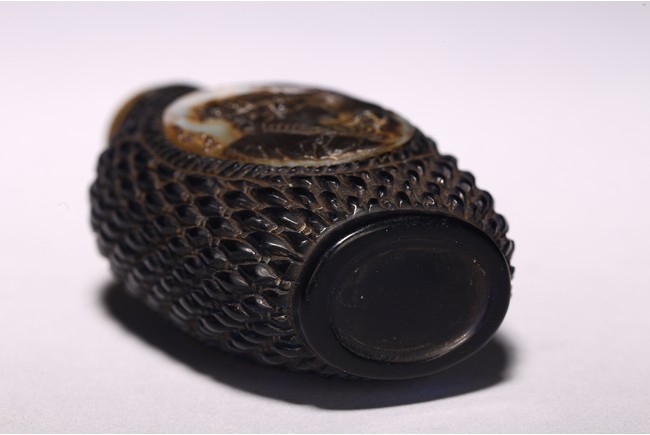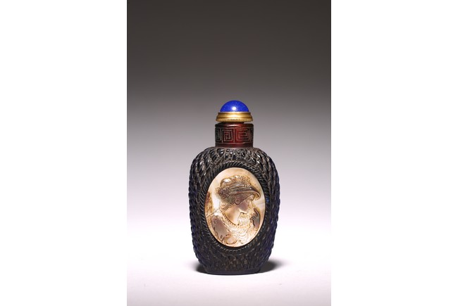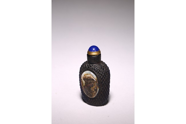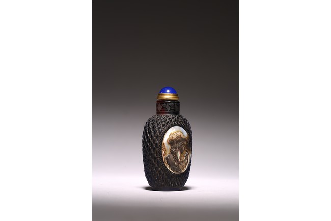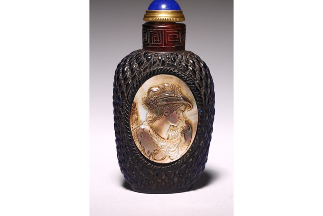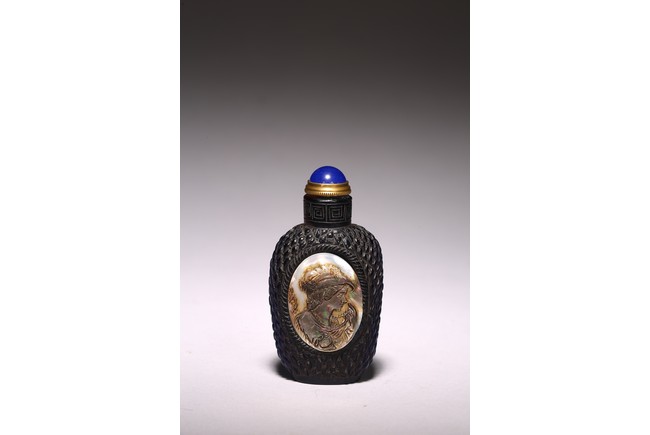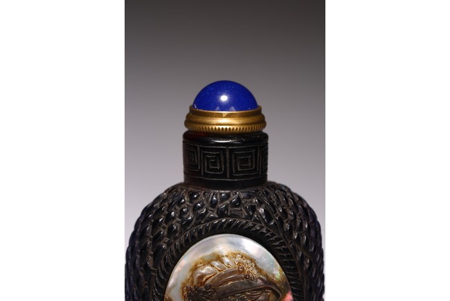 The black glass bottle inlaid with a oval shaped mother of pearl on both sides with carved European figure. Qing Dynasty period.