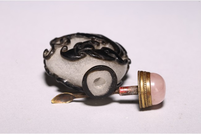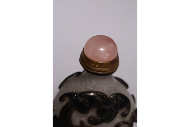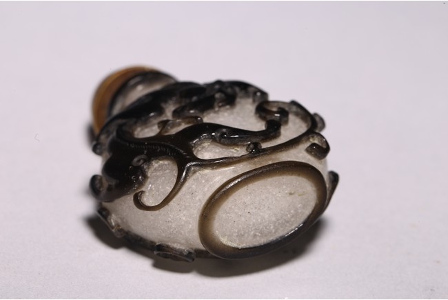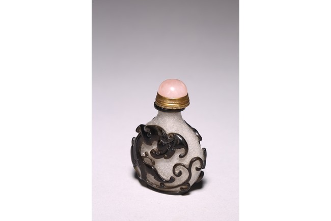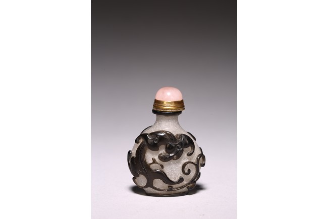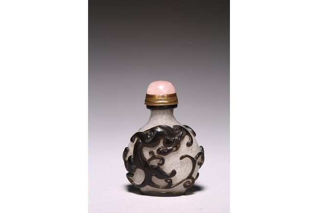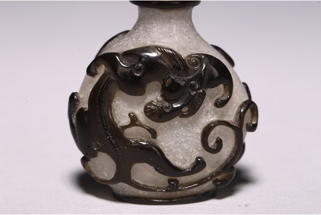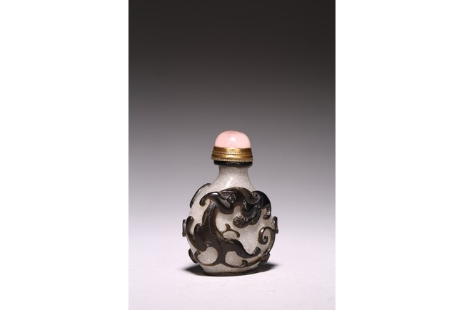 The semi-translucent white bottle carved through a layer of black glass to depict a sinuous chilong on both front and reverse. Qing Dynasty period.