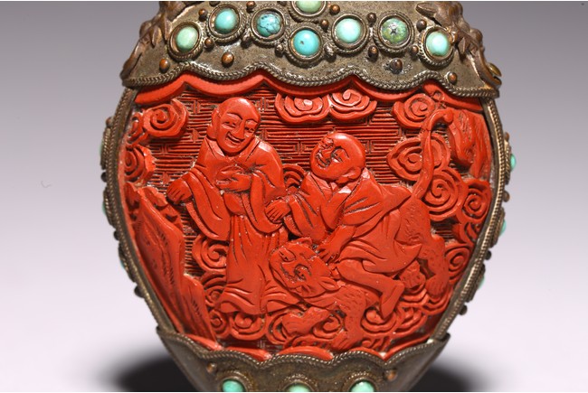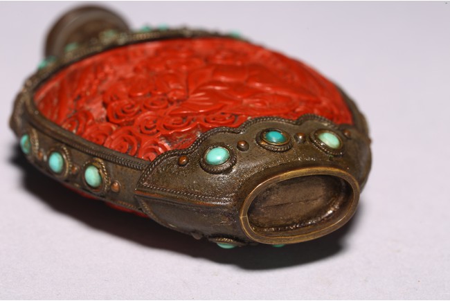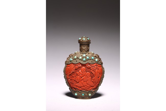 Of ovoid form,the body carved immortals of Harmony and Union to the front and reverse. The turquoise beads inlaid at upper body, bottom, both sides and stopper. Qing Dynasty period.