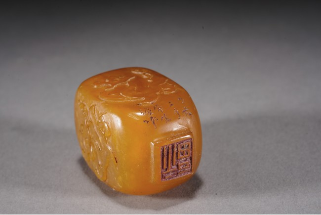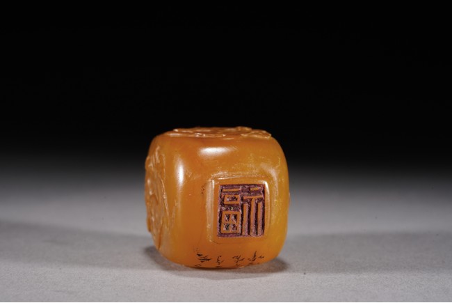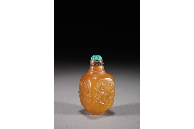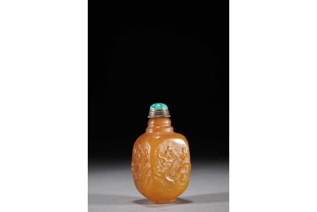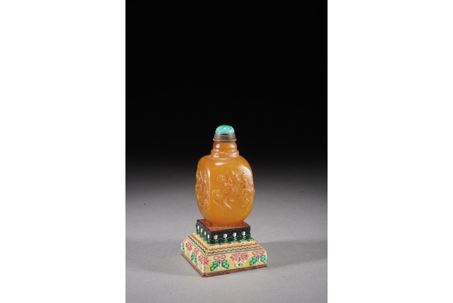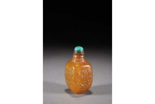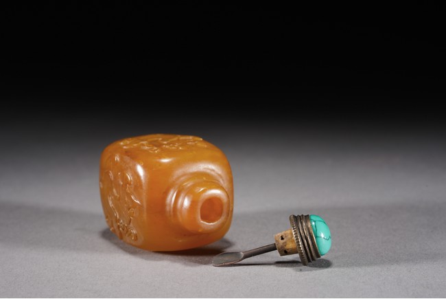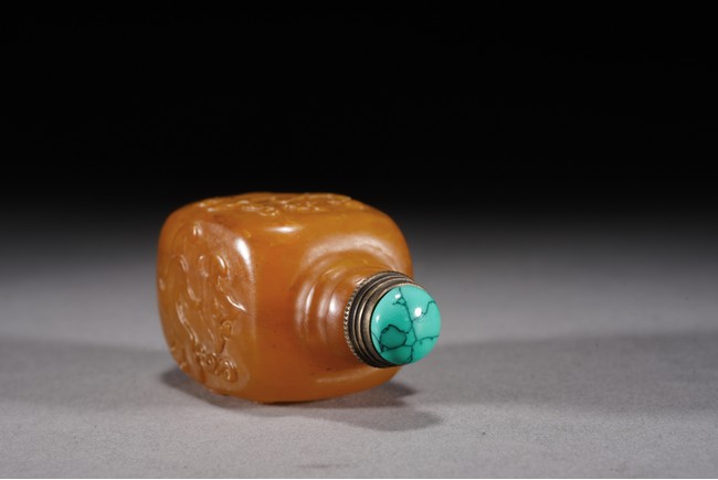 鼻煙壺造型周正,呈方形非常少見,用料精良,溫潤細膩,色澤正黃,雕工精湛嫻熟,難得小巧佳品。