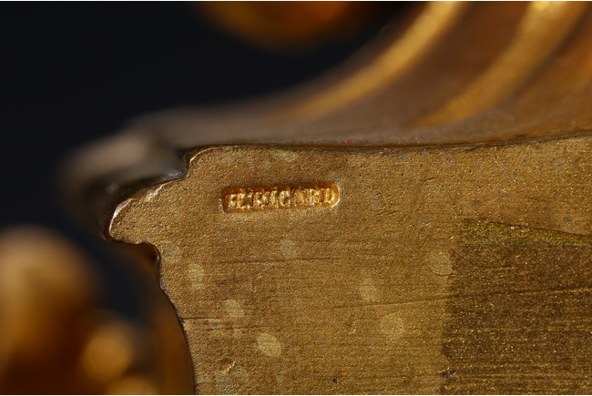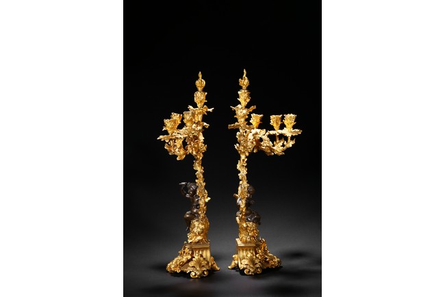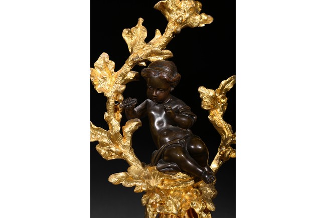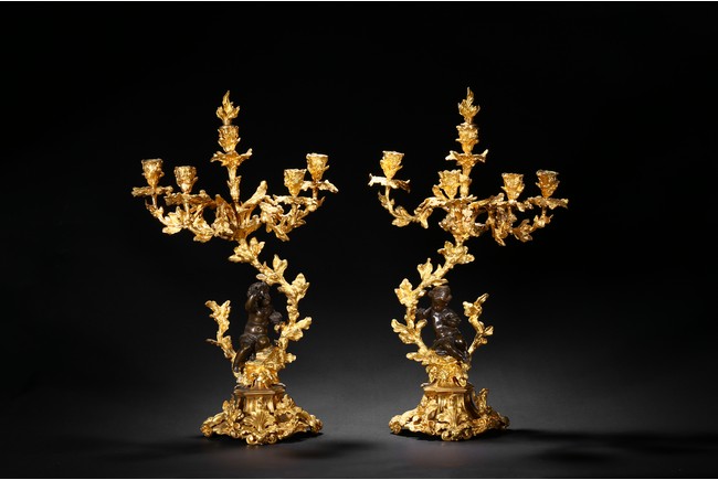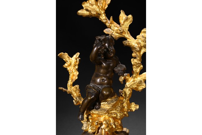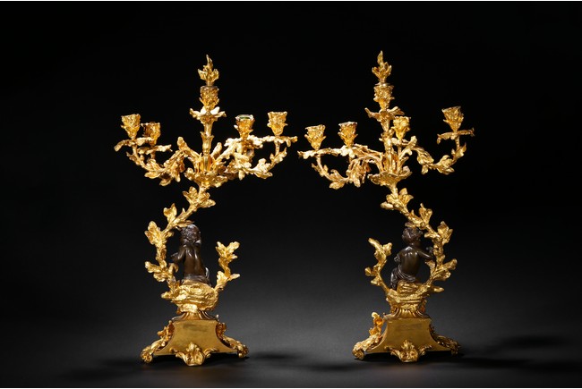 A pair of gilt candlesticks, each of irregular Shaped with bronze boy figure. 19th century.