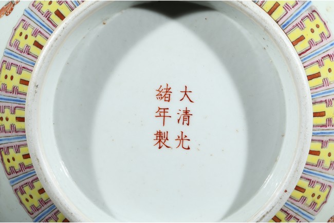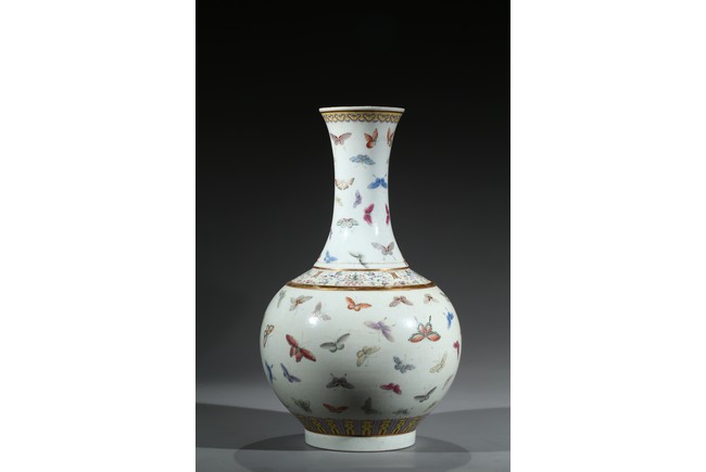 此瓶為清光緒、宣統兩朝御窯彩瓷經典品種,瓶身以粉彩百蝶紋裝飾,俏麗喜慶。整器形制規整,胎釉精良,頸、腹部繪粉彩“百蝶圖”,取“歡天喜地”之吉意,所繪蛺蝶五色煥然,身姿各異,須翅栩然,靈動精采。全器設色豐富,筆觸工致,明快妍麗,陳設效果上佳。