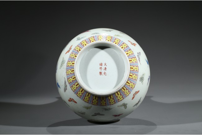 Chinese. The compressed globular body rising from a short foot to a tall waisted neck, decorated with the ‘Hundred butterflies’ design divided by a band of lotus scrolls and stylised shou characters at the shoulder, the rim and the foot with ruyi and lappet bands, inscribed to the base with a six-character iron-red reign mark. Qing Dynasty Guangxu period.