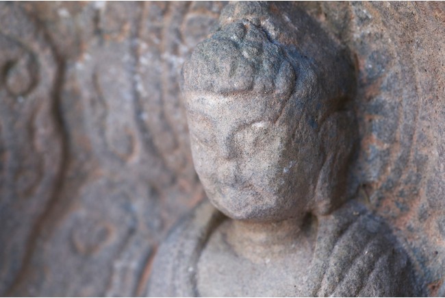 The stone carved shrine shows a standing bodhisattva accompanied with two attendants. Tang Dynasty period.