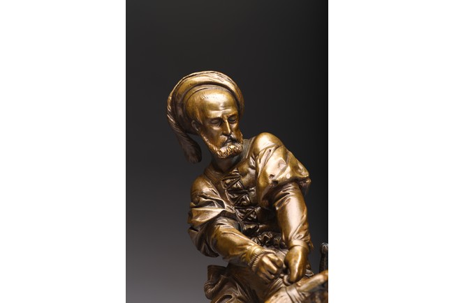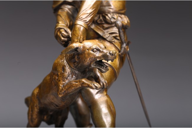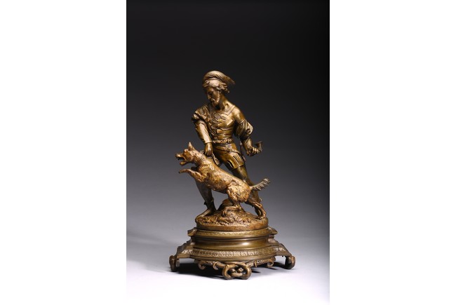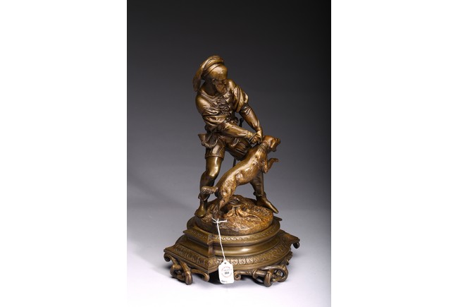 A PAIR OF FRENCH BRONZE FIGURAL GROUP OF HUNTSMEN AND DOGS    十八世紀 銅雕人物'訓犬者'雕塑一對