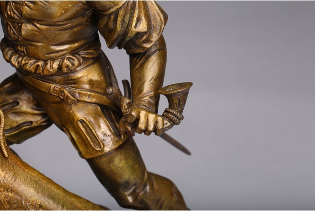 "A pair of large matching figural garnitures of huntsmen and dogs in period dress. The figures inscribed "A. Carrier.""