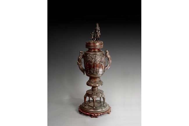 A massive Japanese cast bronze censer consisting of four separate sections, with two tiers of base, each casted with an intricate detailed dragon design. The front and the back of the censer depicts a bird in a bamboo grove scene, and another scene of bird in a chrysanthemum bloom, with two phoenix handles, and the cover is cast with an elder with a child. The base is casted with the mark of the makers. Meiji period, Empire of Japan.