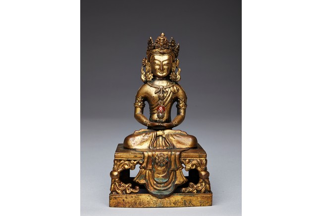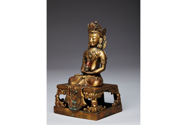 Shown seated in dhyanasana with the hands in dhyanamudra, wearing a dhoti tied over the left shoulder and adorned with beaded jewellery, the head crowned by pointed tiara, all supported on a tapering rectangular throne above the Qianlong reign mark. Qing Dynasty period.