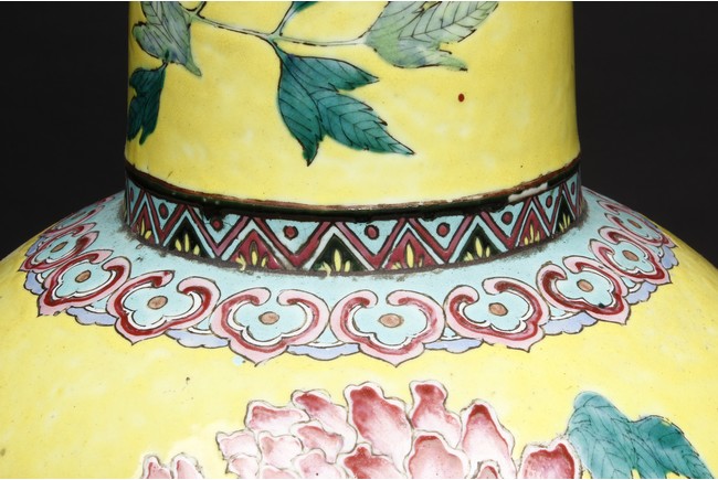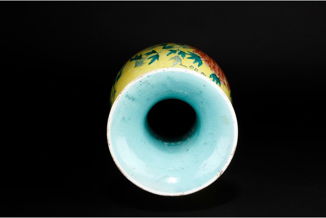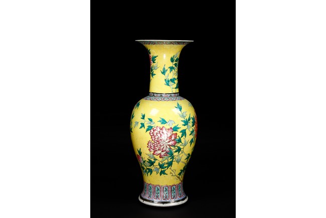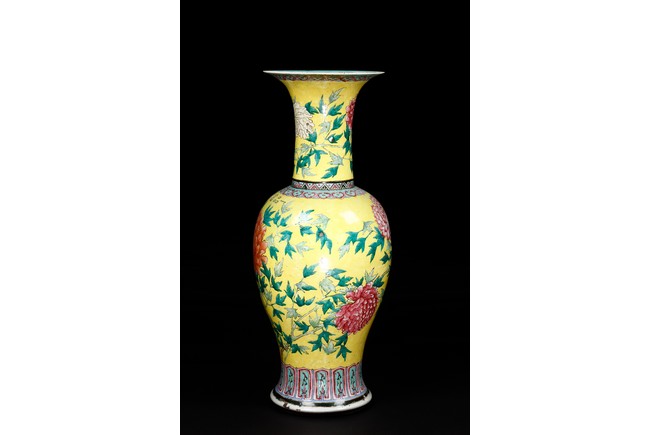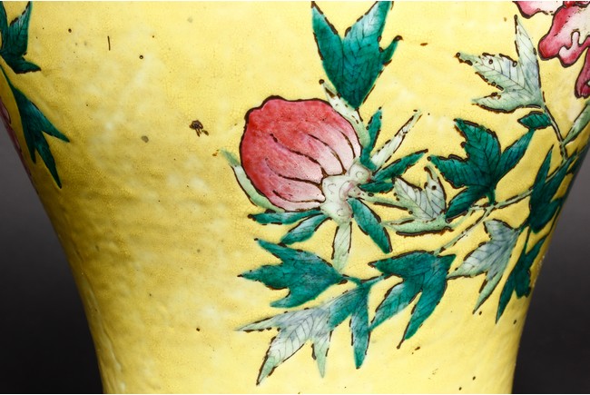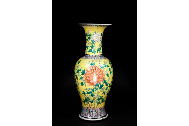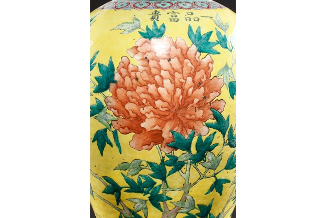 Chinese. Of baluster form, the vase is brightly painted around the body with red, orange-glazed chrysanthemum flowers amongst leafy branches and four characters 'Yi Pin Fu Gui' all against yellow-glazed background. The long flaring neck is decorated in similar manner with chrysanthemum design. The neck and body are bordered between a key-fret and a ruyi-motif band. Qing Dynasty Period.
