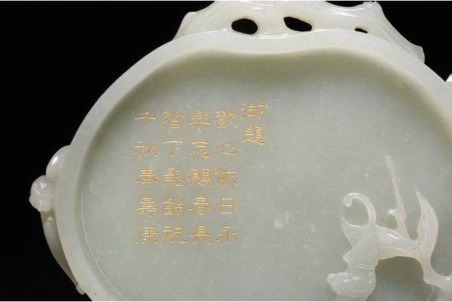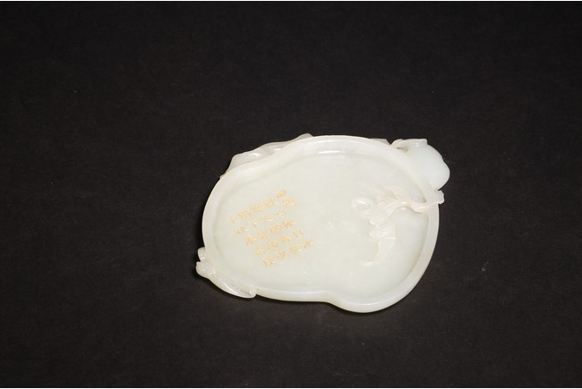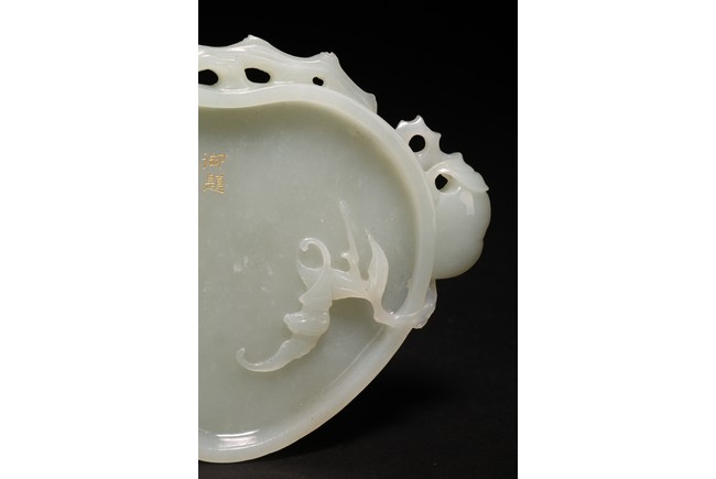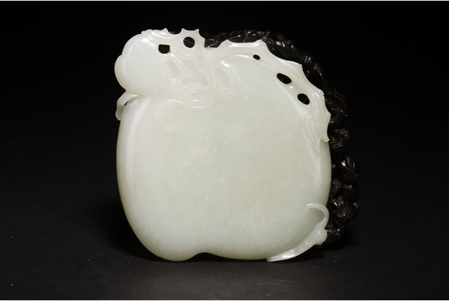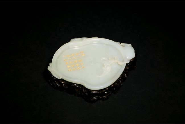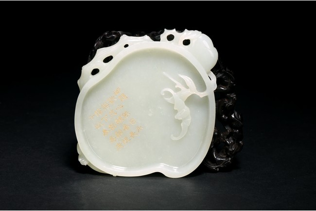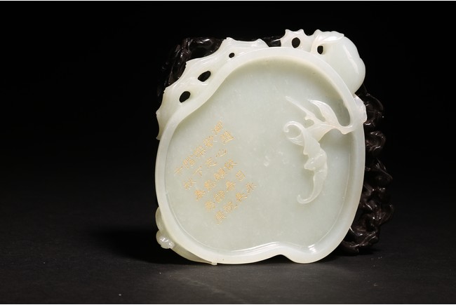 凡作書畫皆需筆舔,使所蘸之墨色均勻,避免發生濃淡不均的現象,清宮所藏筆舔較少,皆為乾隆年間所製,精巧優美,可供賞玩。筆舔除實用意義外,更多的是用於觀賞陳設。它供置於書齋的案幾之上,與硯墨相伴,與文人相對。可息心養性,可助文思,几案之珍,得以賞心而悅目。此筆舔為上等和田白玉製做而成,細潤如脂,質地晶潤,包漿自然亮麗,細膩有光澤。筆舔呈蟠桃型,器側桃樹立體穿插,動感十足。舔心及左側浮雕“蝙蝠”,展翅飛舞,唯妙唯俏。寓意美好,有福壽安康之意。填金陰刻御題詩句“御題 歡心依日永樂志願春長階下松齡祝千秋奉壽康”。整器工精細,工藝精湛,極富情境,寓意深遠,為罕見的乾隆宮廷文房佳器。配紫檀鏤雕木座。