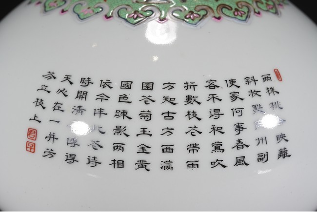 Of compressed globular form, the body enamelled with leafy branches of peaches, chrysanthemum, lingzhi issuing from rocky outcrops, the other side inscribed with poem, the shoulder with a lotus floral band flanked by pair of handles, base with apocryphal mark.