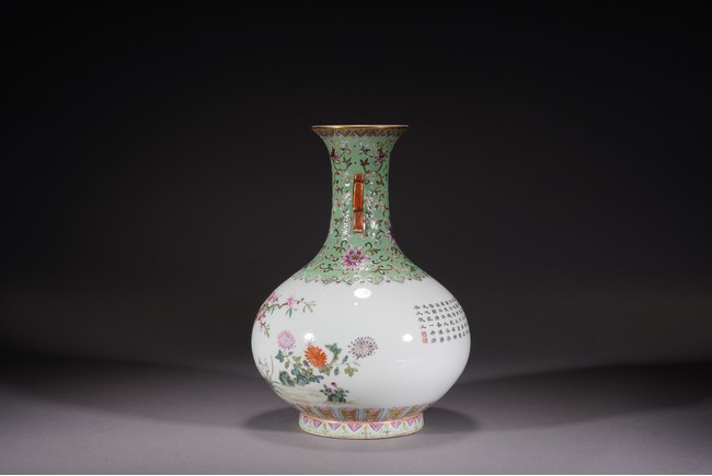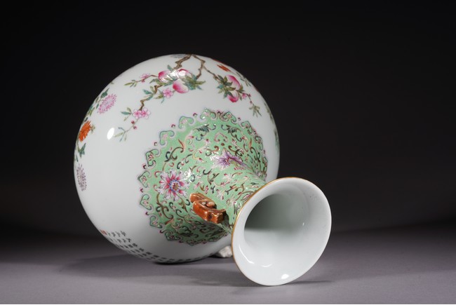 撇口,長頸,鼓圓腹,直圈足。口沿描金繪“如意雲紋”,頸部以綠釉爲地,繪“纏枝花 卉托“吉”字紋”,“吉”字描金。腹部正麵粉彩繪“靈芝壽桃紋”,紋樣線條流暢,描繪細 膩,填色準確,層次分明,用色極爲豐富。反面御題詩文,字跡清晰,排列規矩。 “永慶長 春”礬紅款,是清末光緒時期官窯瓷器吉語款,爲慈禧太後壽辰特製。