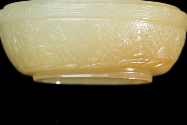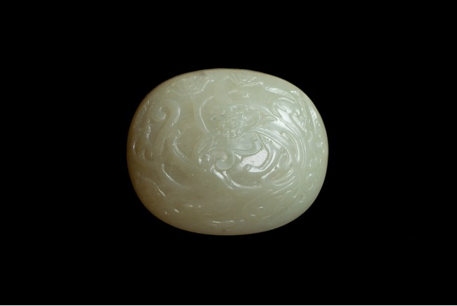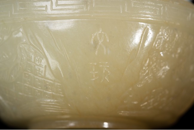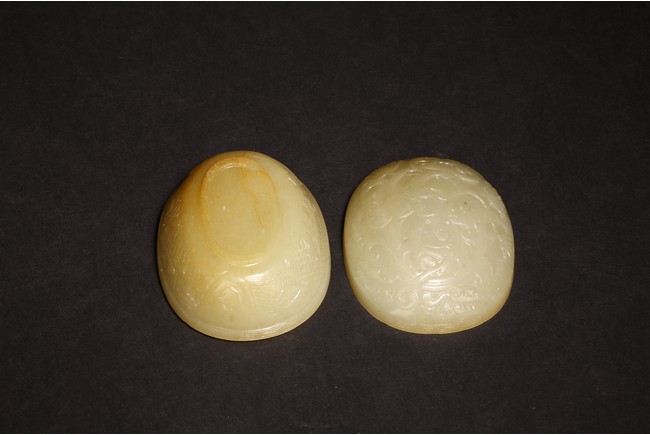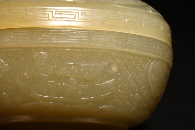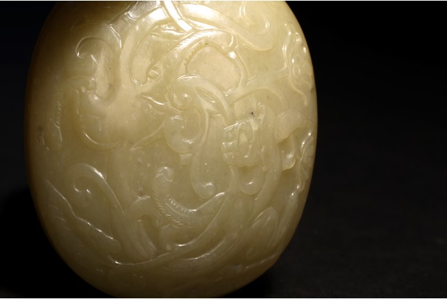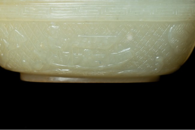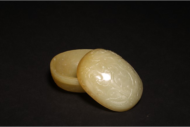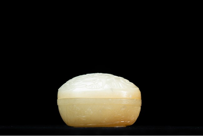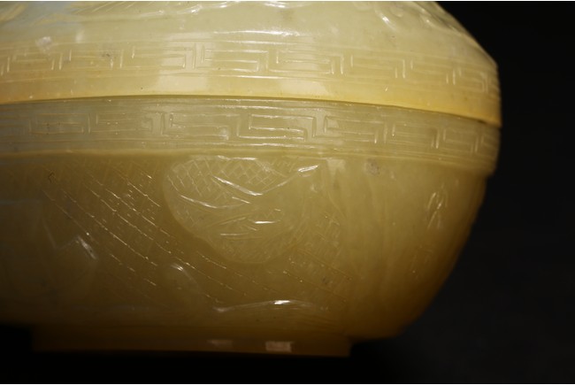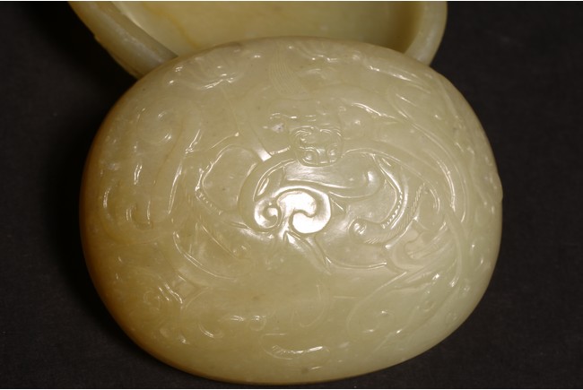 蓋盒呈橢圓型,蓋與盒子母口相接,扣合嚴密。玉質溫潤細密,包漿厚重,瑩潤光潔。蓋面蓋身口沿皆飾”迴紋“一周,蓋面雕飾“穿花螭龍”,充滿動感,力道十足,神態極盡威武森嚴之勢。蓋身四周以“卐“字為地,上淺雕刻“漁家樂圖”,“松樹”“漁夫垂釣”“漁船”。構圖嚴謹,形像生動,畫面感十足。 “文玩”落款。