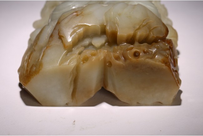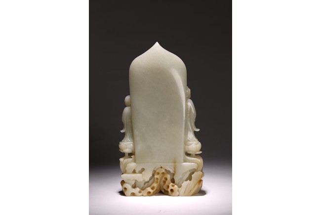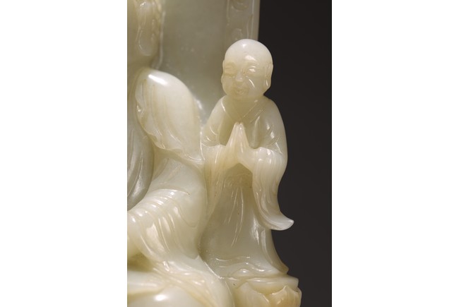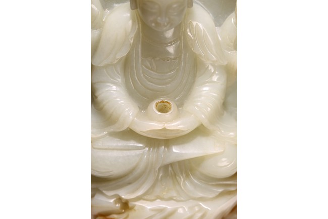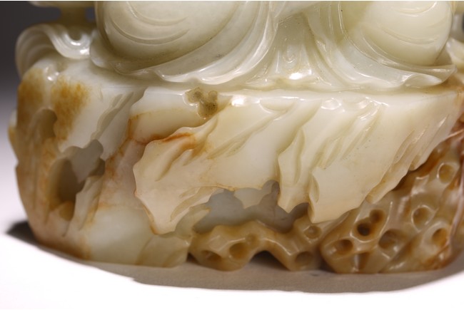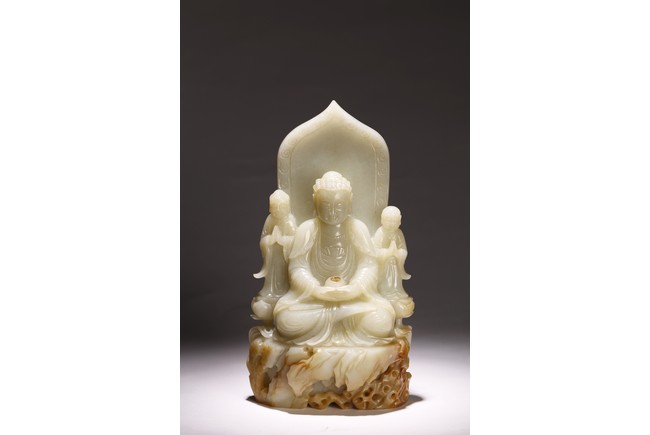 此坐像以精美大料和田玉精琢而成。玉質細膩溫潤,光澤瑩亮,油潤度極佳。造型豐盈飽滿,包漿細膩溫潤。跏趺坐於山石之上,兩手平放於腿上持缽,面相表情安祥,和藹可親。身後兩小彌僧筆直站立於蓮花台上,雙手合十。身後背光高聳,邊緣雕色連紋。整體造型端莊,神態安祥,給人肅穆之感。材質珍稀,包漿自然,尺寸碩大,非常難得,供奉佳器。