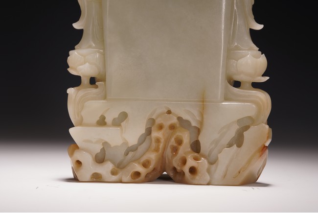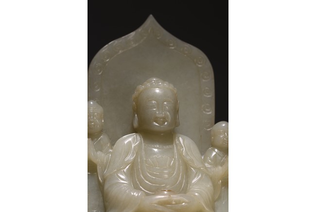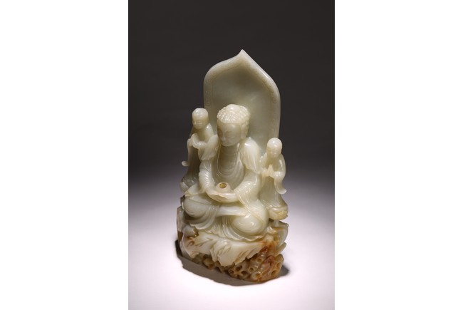 The white jade carved Buddha is shown seated in padmasana with hands resting atop the feet holding alm bowl, wears layered robes, and his hair is carved in rows of curls below the ushnisha, flanked by two standing attendants standing upon lotus blossoms, all against a large mandorla and supported on carved rocky base.