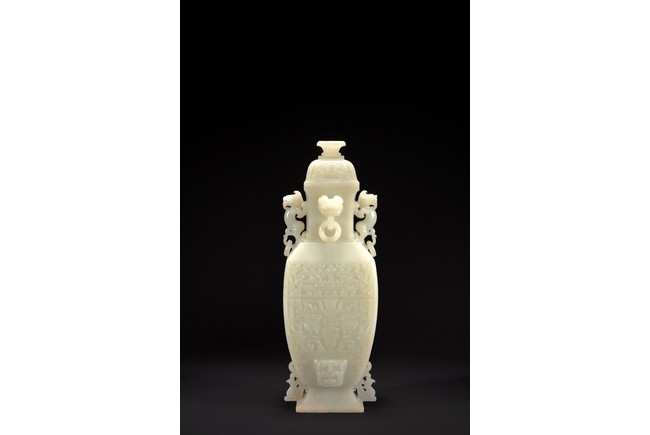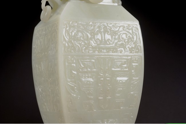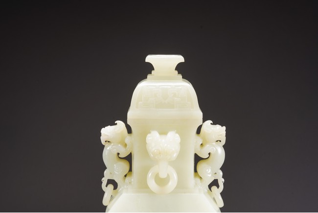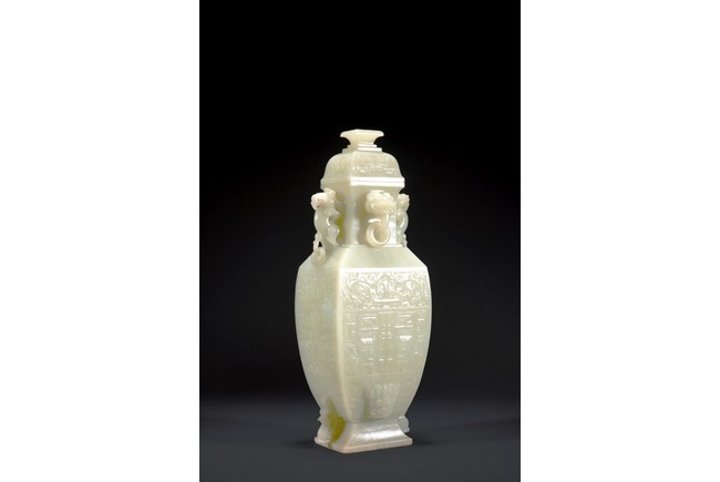 Of rectangular section, the body of slightly tapered form rising from a low splayed foot, the body finely carved in low relief with stylized taotie mask in the central band below band of lotus foliage scrolls and above a raised beast mask, the waisted neck set with two pairs of mythical beast handles, the domed cover below a stepped finial.
