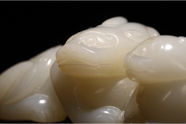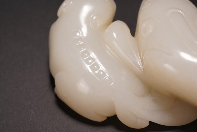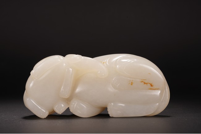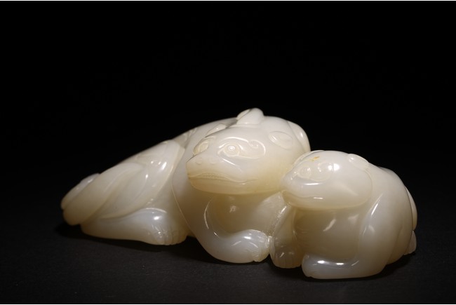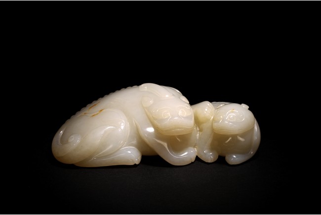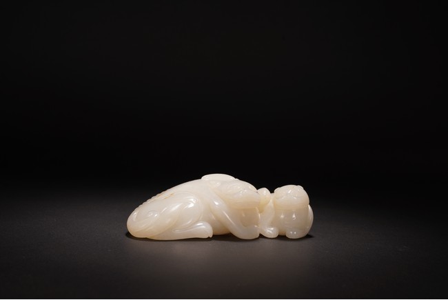 此擺件以和田白玉為材,採用圓雕工藝雕琢而成。歡為一大一小,小歡依偎在大歡身旁,親暱自然,造型可愛,憨態可掬。玉質溫潤細膩,潔白如凝脂,雕工精細,製作精湛,用料碩大,難得的文房大擺件。