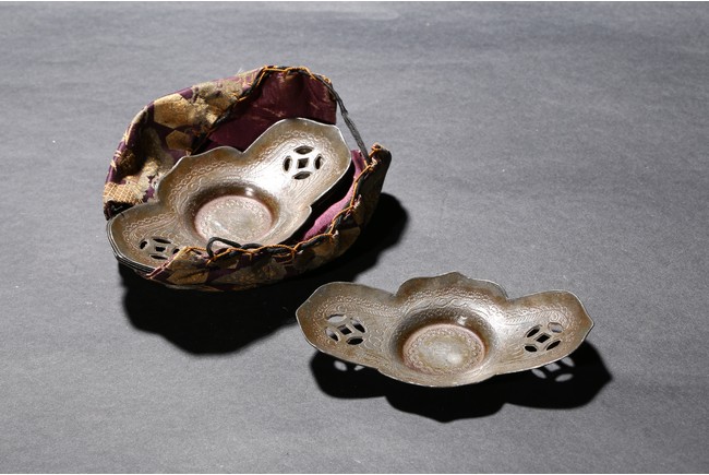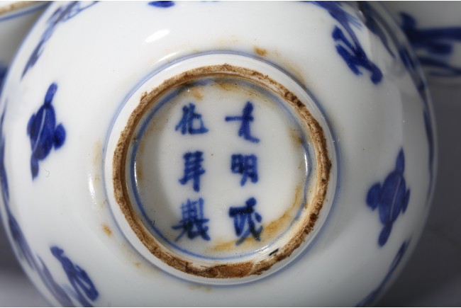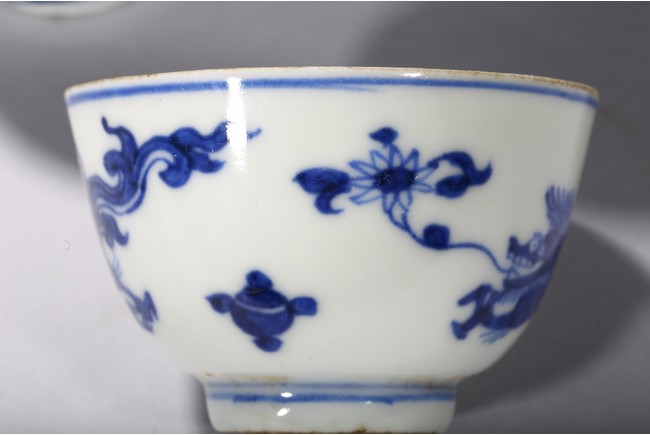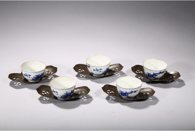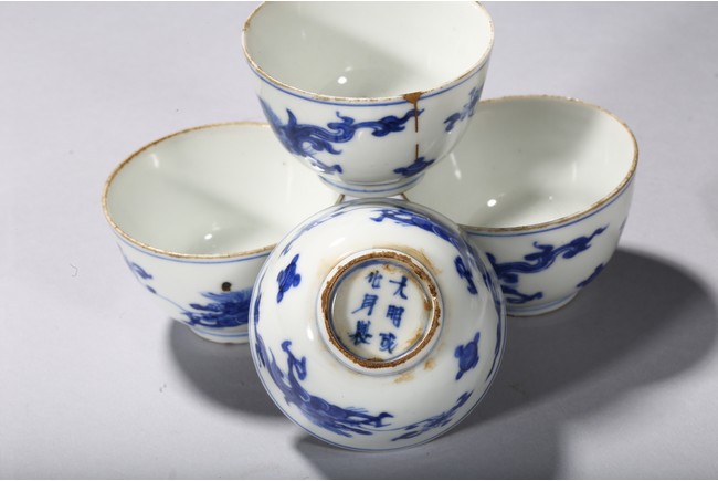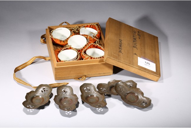 Chinese. Of rounded sides, the exterior decorated with stylized dragon in pursuit of flaming pearl, the base with six character chenghua reign mark, all accompanied with five silver boat-shaped cup holders and Japanese wood box. Ming Dynasty period.