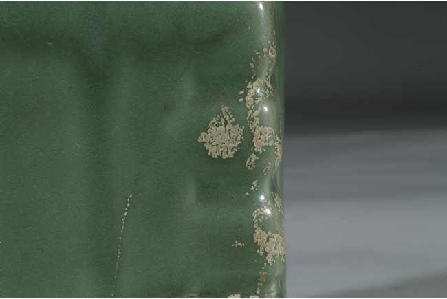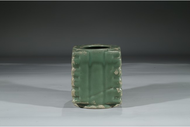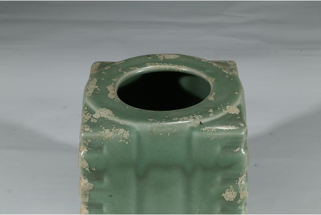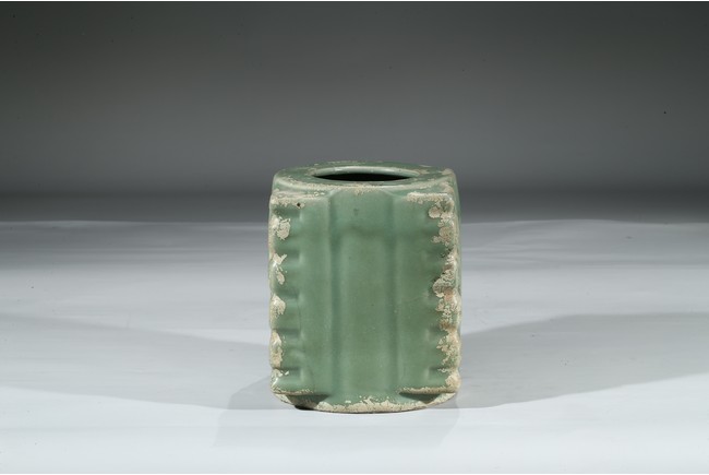 Of rectangular Shaped and square section moulded with archaistic ribs at the corners on each side, covered with olive green glaze overall.