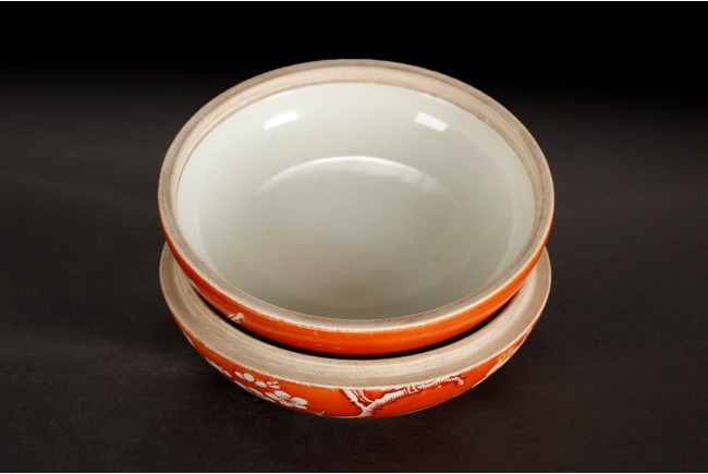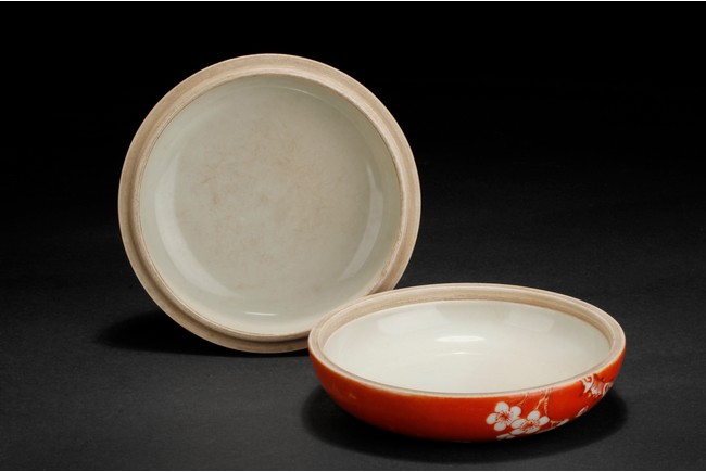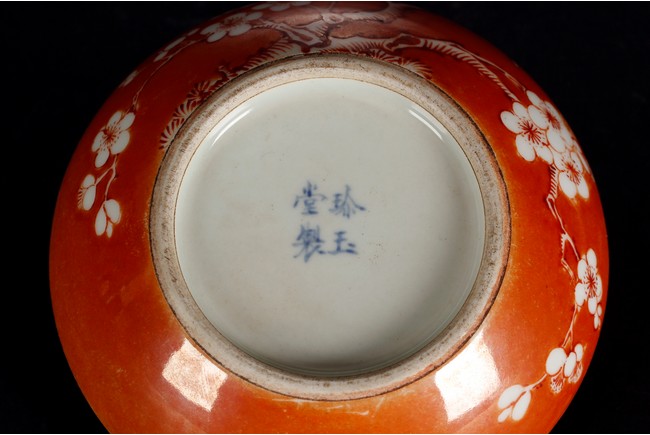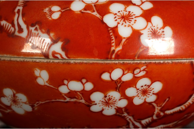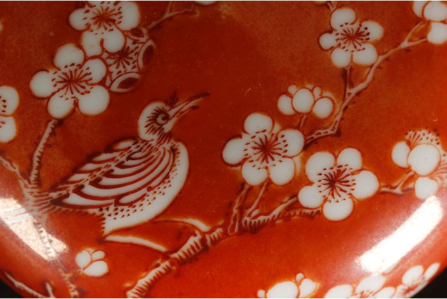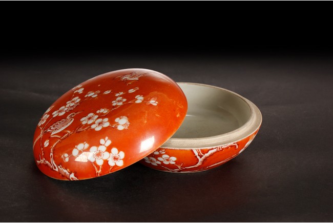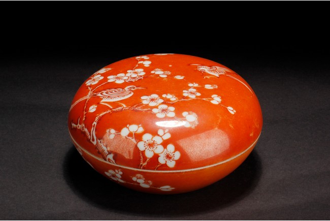 Of flattened ovoid form, the ink cover box covered in coral red glaze, with a magpie perched on blooming plum tree, and another magpie flying towards it, bottom bears four character 'ZHENYUTANG' mark. Republic period.