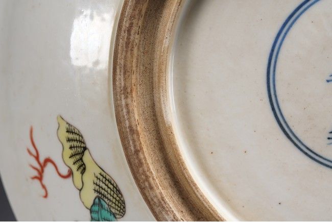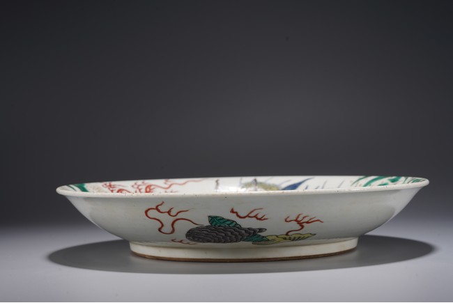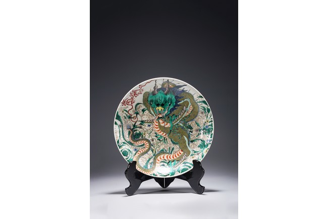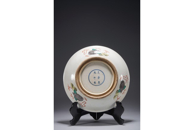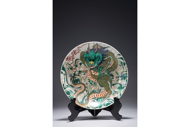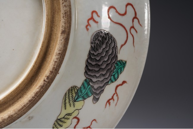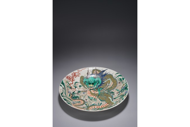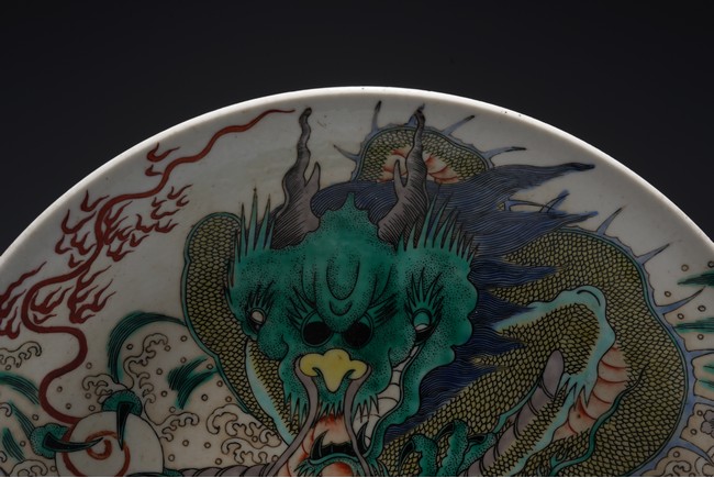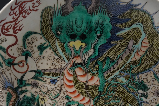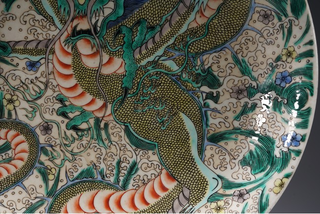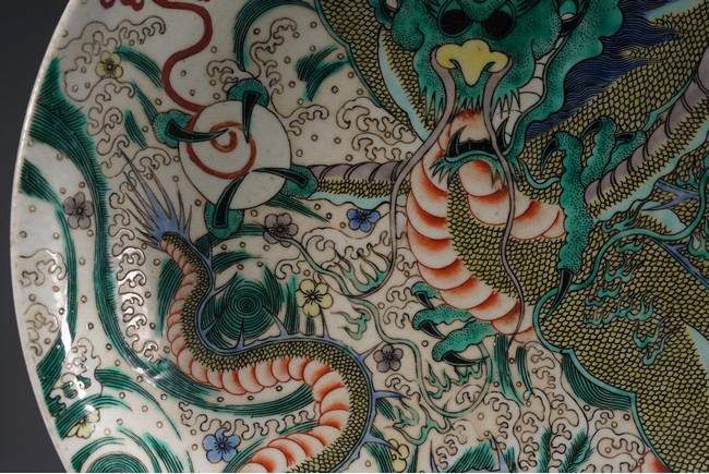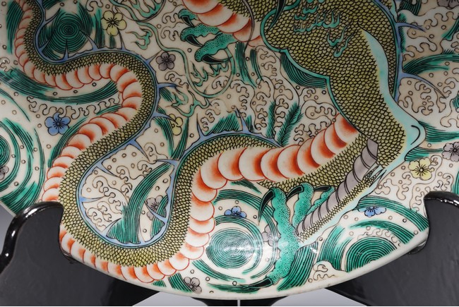 此盤紋飾以釉上紅、綠、黑、黃及孔雀綠彩所繪。盤心為一正面龍紋,由波濤中躍至雲際,龍脊鰭作錐狀。四周輔以波濤海水怪石江崖環繞。盤心繪雲龍紋,龍呈正面像,趾爪鋒利,盤虯有力,其鬢須拂動,氣勢凜然,畫麵線條流暢,塗繪準確。