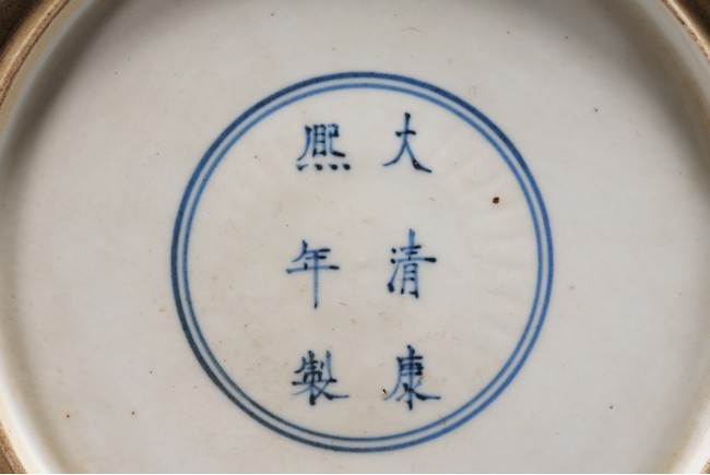 The dish interior painted with a ferocious four dragon holding a pearl on one claw emerging from the sea, the base inscribed with Kangxi reign mark. Qing Dynasty period.