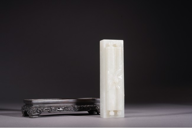 從乾隆二十四年開始,是清代玉器發展由平穩轉向巔峰的分界,回疆平定、 城市經濟的繁榮和附庸風雅、收藏文玩之風的勃興,爲玉器的發展提供了物質和 社會環境的有力支撐。根據相關檔案記載推斷,僅僅乾隆五十四年內務府採辦和 市場流通的玉料就超過十萬斤,且此時宮廷造辦處與民間玉坊的互動,極大的促 進了工藝的改進和提高,出現所謂的“新樣”、“時樣”,成爲輝煌乾隆玉器文 化的重要代表。採用上等和田白玉製作而成,嫩白如脂,玉質溫潤,玉理精堅,冰潔無 瑕,不著一塵。此鎮紙設計極其特殊巧妙,爲一整塊包袱巾,布紋褶皺清晰,飄 帶圍繞書卷紮起,系成蝴蝶結狀,造型富有創意,獨具特色,爲乾隆時期出現所 謂的“新樣”、“時樣”。其下爲文具書匣,以“錦地紋”爲地,中間海棠型開 光繪”螭龍紋“,刻畫細致,龍作回首狀,身姿矯健,給人以威嚴大氣、穩重肅 穆之感。整體紋飾繁而不亂,極其細致奢華。整器形式獨特,選材極佳,線條優 美,玉雕工藝精湛,代表了乾隆時期制玉最高水平,“包袱”因與“包福”諧音, 故寓意幸福吉祥。據記載,書函式及包袱式的器物大多是皇帝下旨承造,更是供 皇帝本人觀賞與使用,與其它宮庭陳設相比,更顯意義非凡,象徵至高無上的皇 權。配浮雕”雲蝠紋“木座,質料上乘,木色深沈,線條幹練,工藝精湛,古意 盎然,底部描金刻有”丙“字。