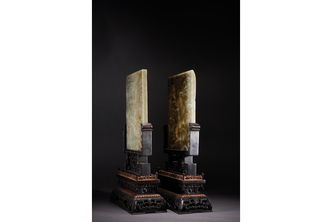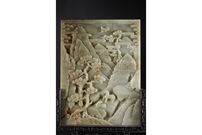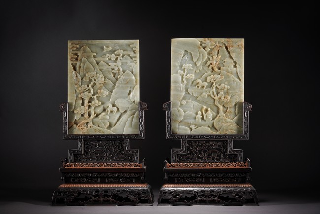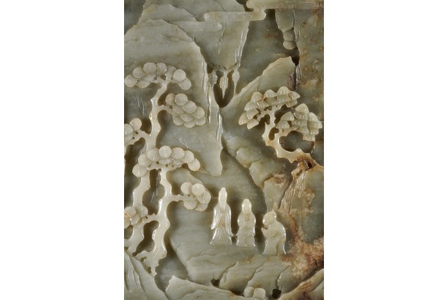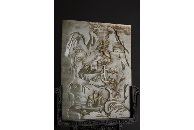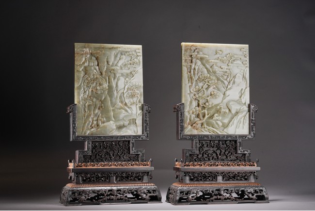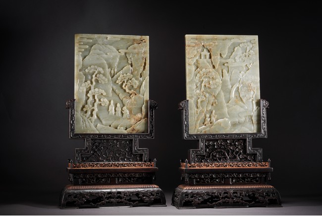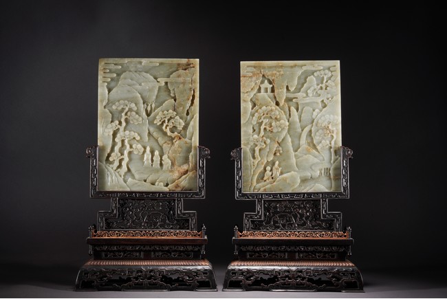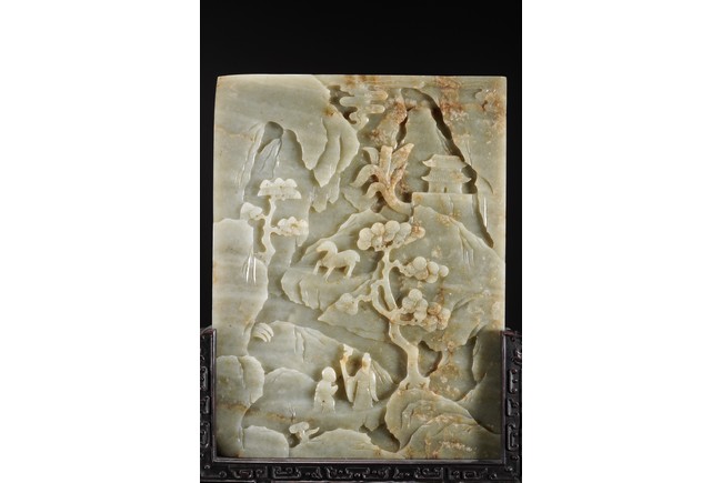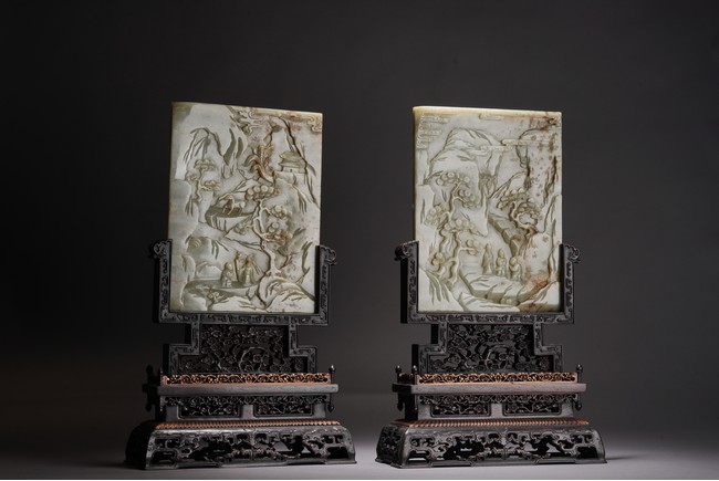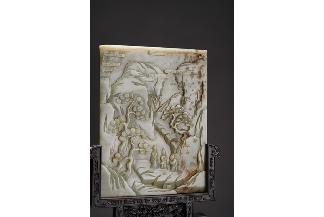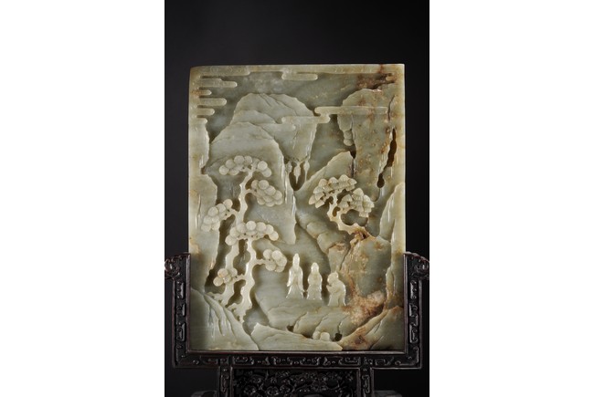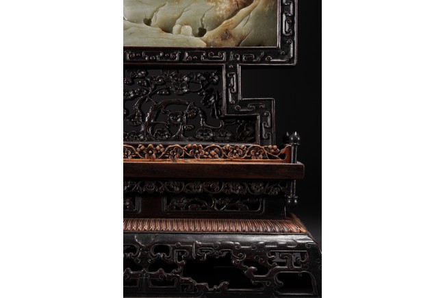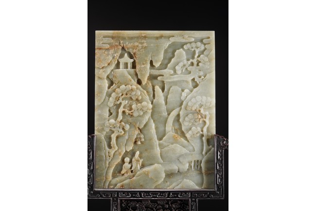插屏前後共四面減地陽刻祥雲遊蕩,山巒起伏、古松參天、亭台樓閣、蒼穹玉宇,高士立於山側或坐於樓台間。連綿的峰巒,高低錯落有致;方正規矩的屋舍,寬敞大氣;拏雲攫石的古松,虯枝屈曲盤旋,人物安排和諧有序,似相互獨立又似互相關聯。整體圖案層次分明,佈局疏朗有致;雕琢精巧逼真,細緻入微,與明清山水畫境的表現有異曲同工之妙,觀之令人不禁產生心曠神怡之感。