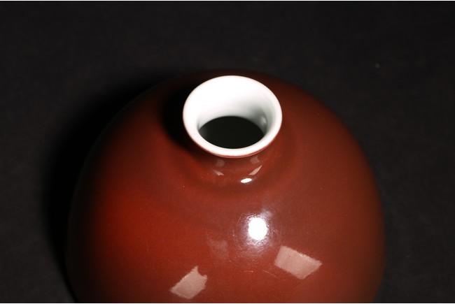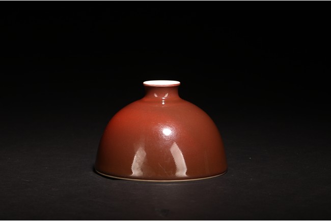 太白尊」因形似唐代詩人李太白飲酒的酒壇而得名。本品侈口小巧,外翻如唇,短頸,溜肩,鼓腹呈半球形,器身滿施紅釉,嬌嫩艷麗,底部淺圈足修整圓潤,胎質潤白堅致,“大清康熙年制”款識。