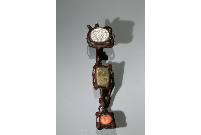 Inlaid with jade on the ruyi head, the body with green jade plaque, the end inlaid with coral.