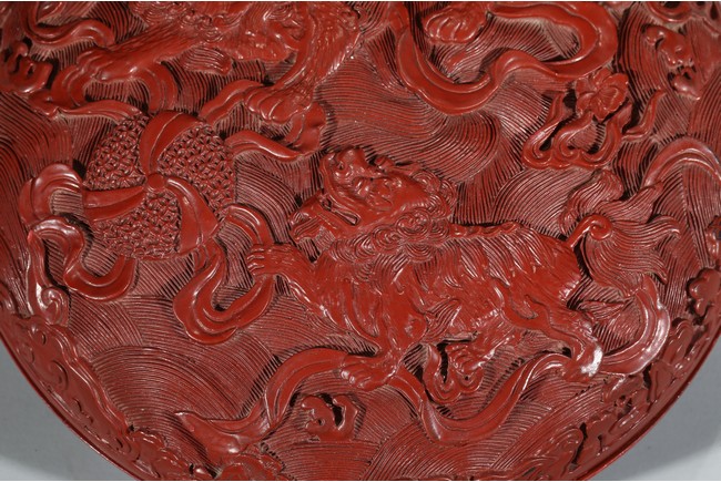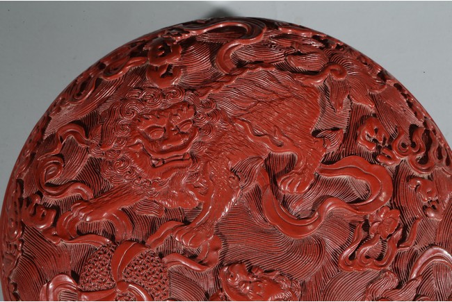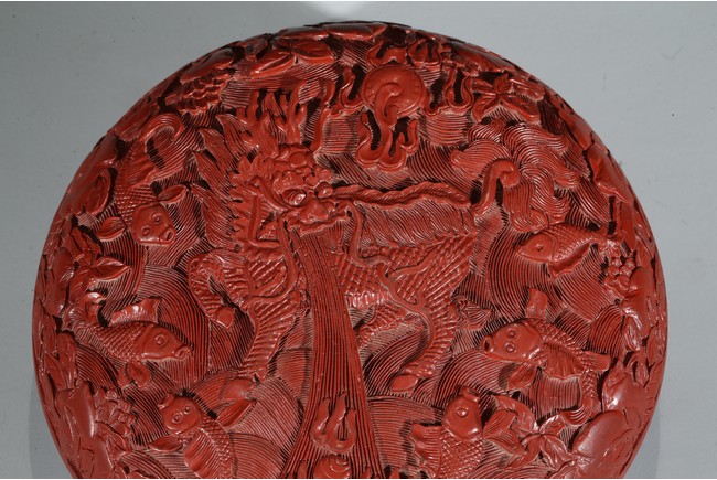 蓋盒為圓形,子母口,器底下凹成圈足,造型周正,樣式美觀。通體髹朱漆,漆色紅潤,蓋面雕有雙獅戲繡球、鯉魚飛躍紋樣。雙獅毛髮隨風飄逸,威風凜凜,自由嬉戲;鯉魚張嘴飛躍於海水之上。整幅畫面呈現祥瑞之情。