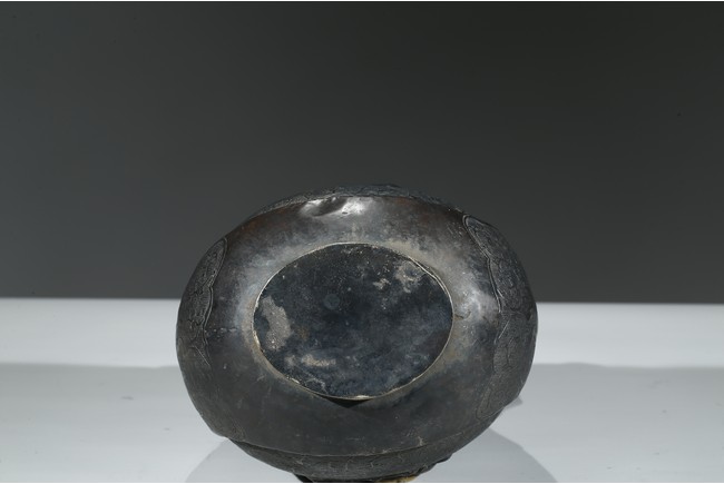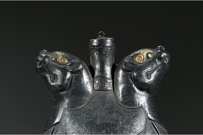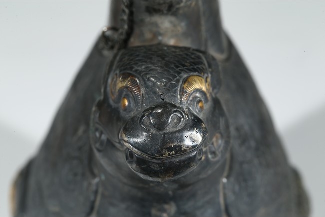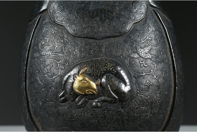 此扁壺為銀胎,雙獸眉眼、犀牛面部銼金。紋飾極為豐富,“麒麟紋”、“纏枝紋”、“犀牛紋”、“飛鳥紋”。口沿左右立體雙獸,雙獸直視前方,齜牙咧嘴,神態逼真,威嚴霸氣,惟妙惟俏。整體造型規範、做工精細、裝飾繁縟、品相完好、工藝精湛。
