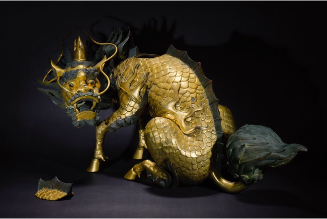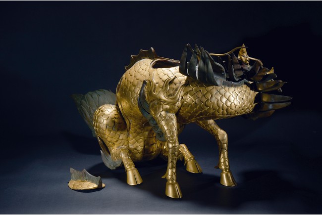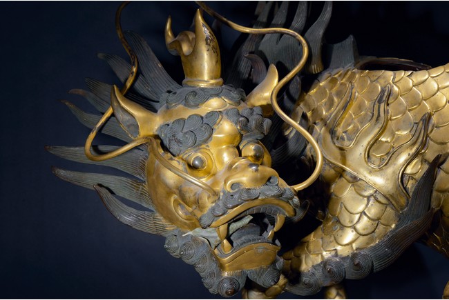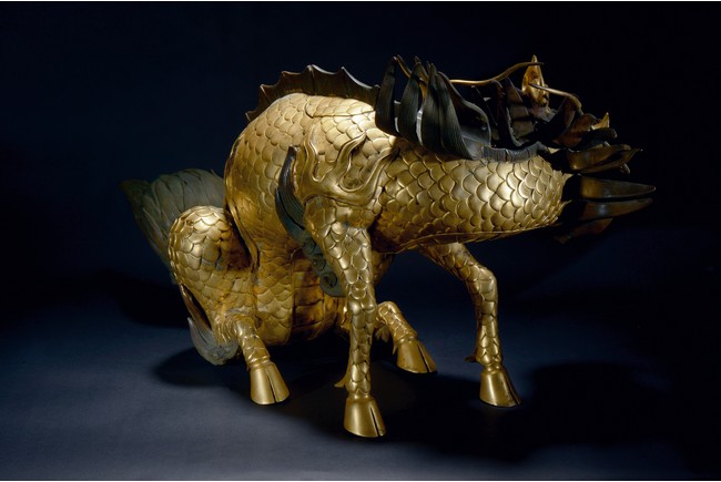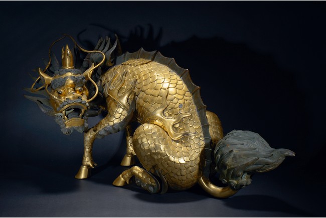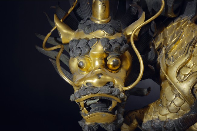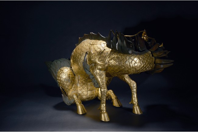 The censer is modelled as a qilin with head turned sharply to the side, with mouth agape in roar, with incised mane and tail, the scales on the body richly applied in gilt, the cover finely incorporated into its back. Qing Dynasty period.